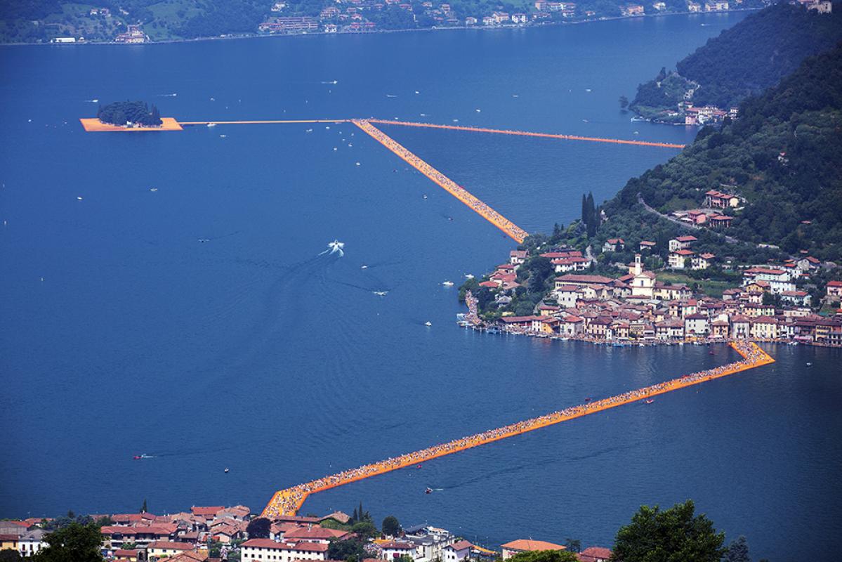 The Floating Piers is a site-specific work of art by Bulgarian artist Christo, consisting of 100,000 square meters of yellow fabric, carried by a modular floating dock system of 220,000 high-density polyethylene cubes installed at Lake Iseo near Brescia, Italy. The fabric creates a walkable surface between Sulzano, to Monte Isola and to the island of San Paolo. On June 18, 2016, the saffron-colored walkway opened to the public. 270,000 people visited the free installation in its first five days.