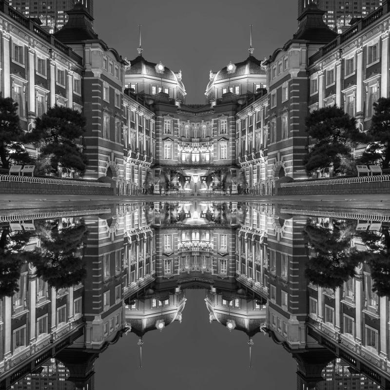 This is Tokyo Station of Japan. It has taken using the reflection made on the day of rain. Bonding reversed from left to right, are represented a mirage.