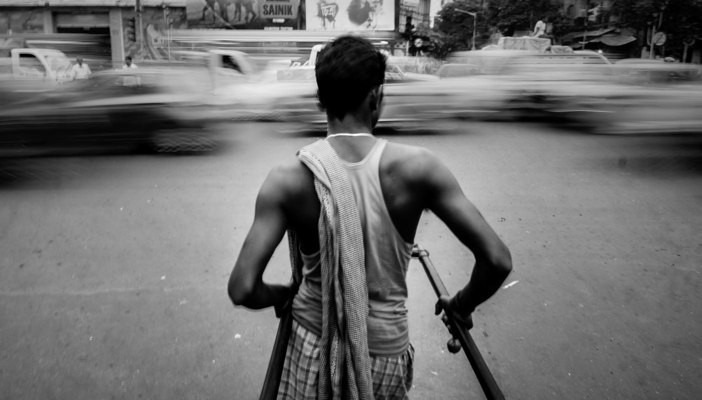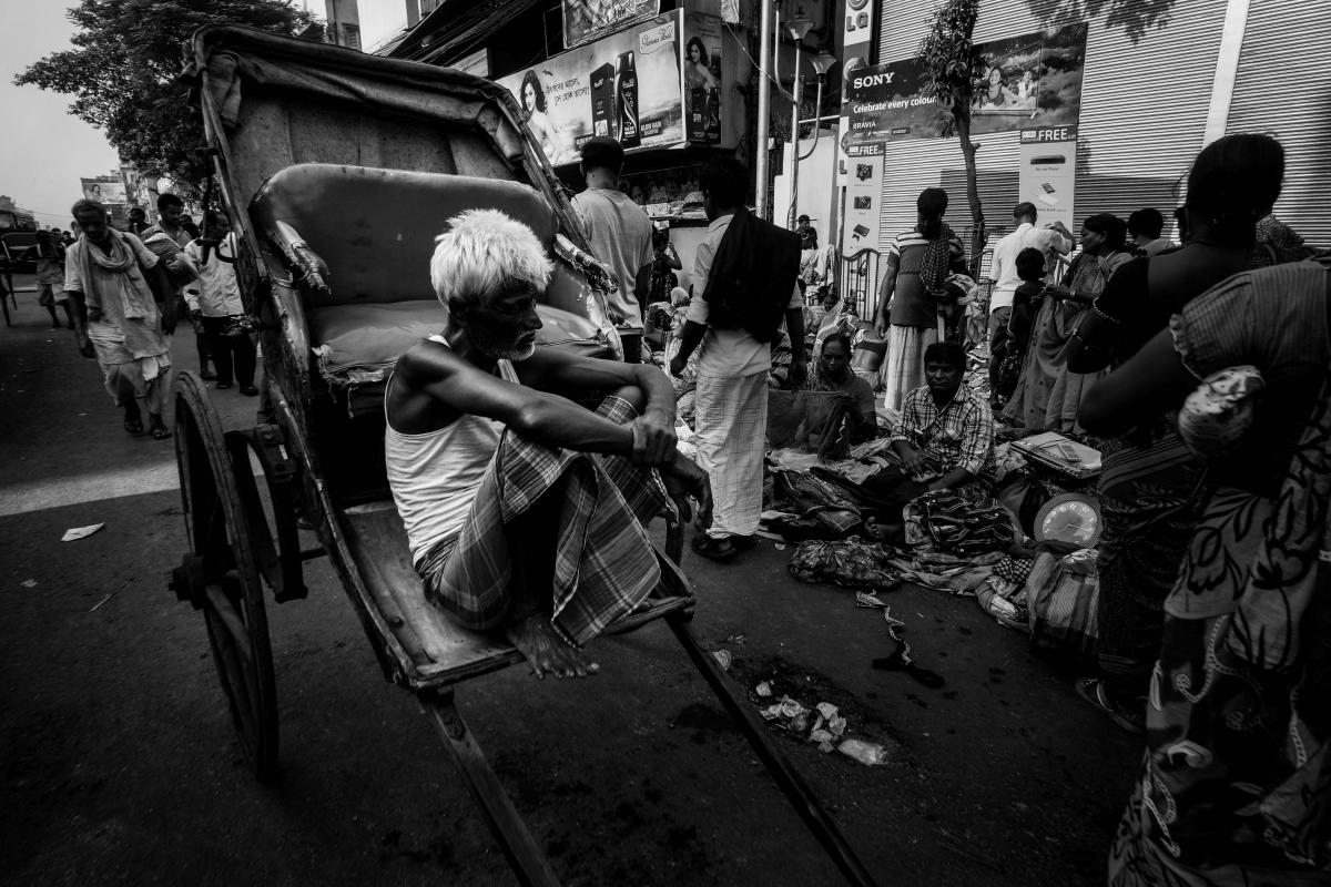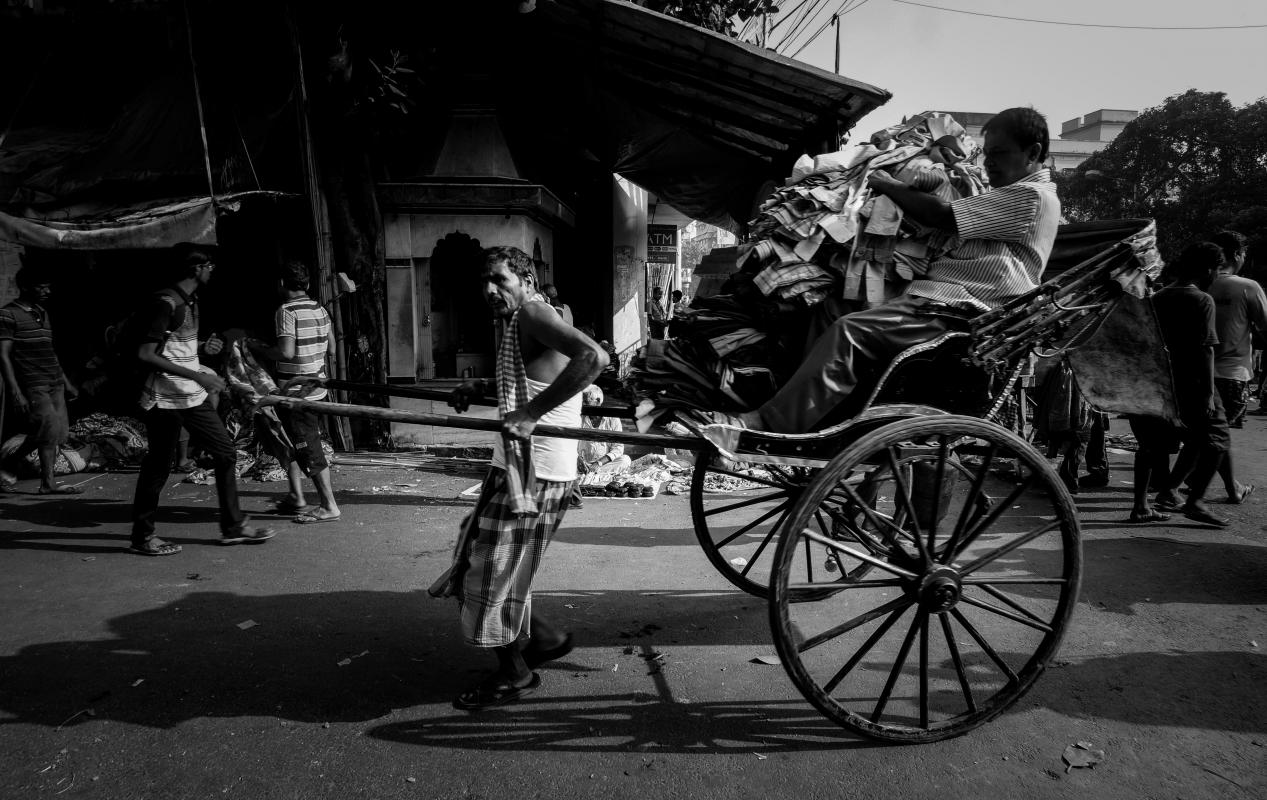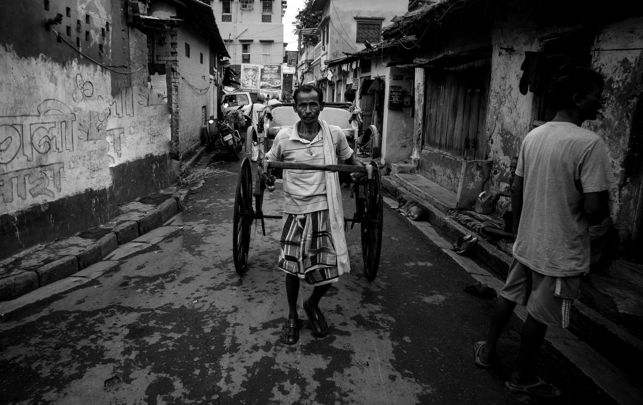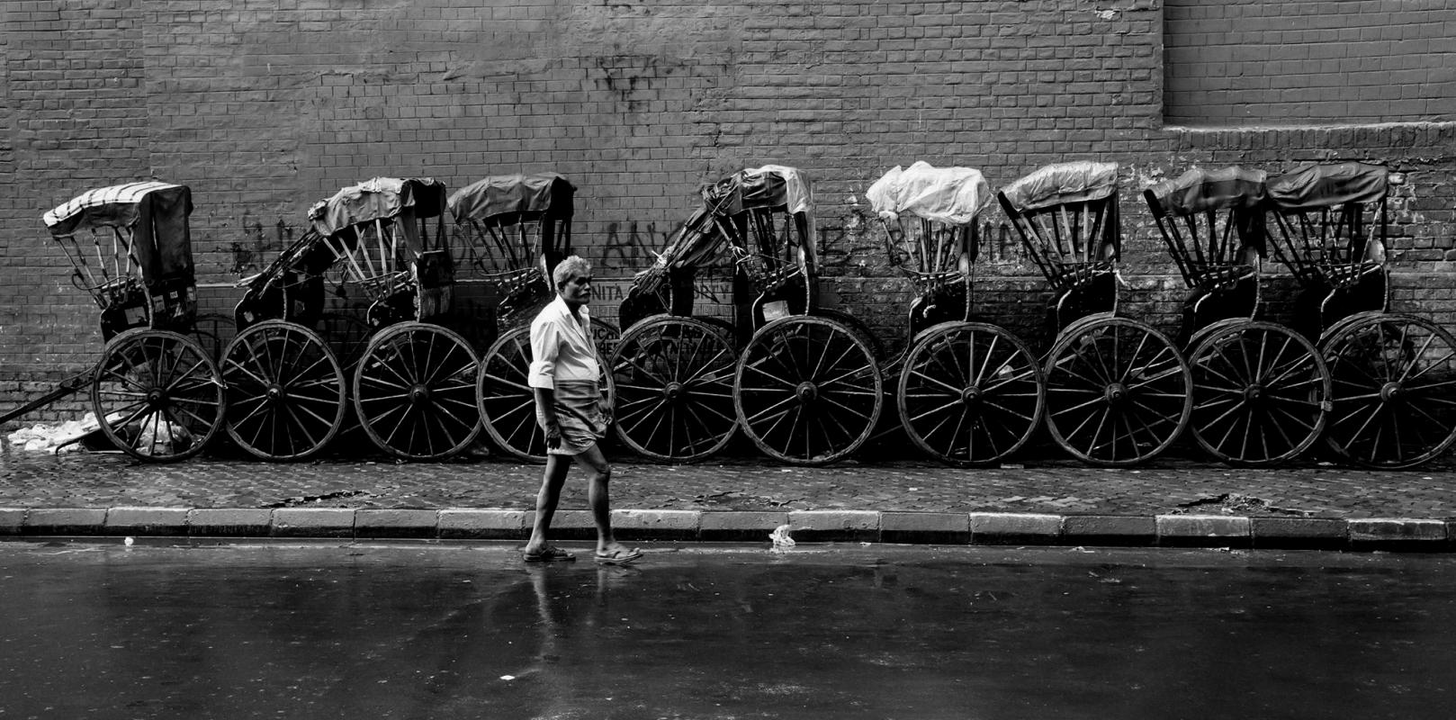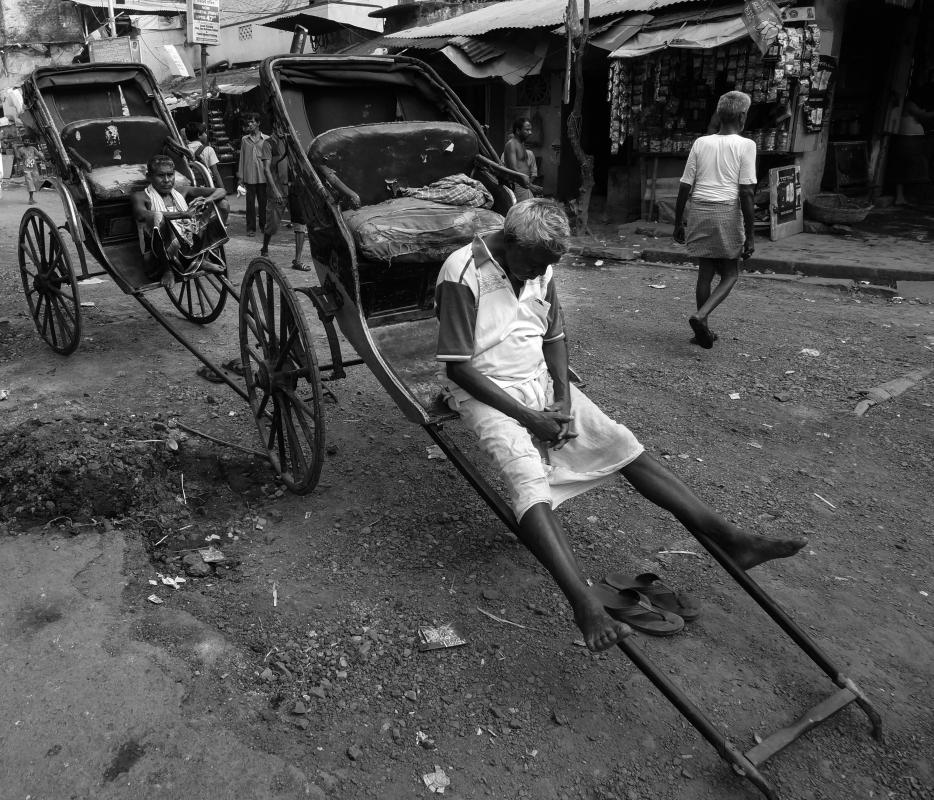 The presence of the hand-pulled rickshaw even today in Calcutta perhaps encapsulates the existential crisis that defines the city. It is a metropolis that still perpetuates its colonial legacy in its distinctive architecture, struggles to keep pace with the rest of the country and is marked by disruption and chaos. The rickshaw, therefore, is symbolic of the city striving to come to terms with the pressing concerns of a modern society. Since the end of the 19th century, hand-pulled rickshaws have been plying the streets of Calcutta. They have witnessed to and remained an integral part of Calcutta’s socio-economic evolution for over 100 years. By the time the wooden version of the Japanese rickshaw made its way to Calcutta, the then capital of British India, in the 1890s, the city’s aristocratic families and zamindars (landlords) used to ride palanquins. The man-pulled, embellished palanquin was a symbol of the elite’s socio-economic status. Soon, hand-pulled rickshaw became the middle class people’s answer to palanquins. In Calcutta, a rickshawwallah’s day starts early in the morning at 5 o’clock and ends by late in the evening through a schedule of strenuous labor at daytime. They deliver goods from one place to the other, carry children to schools and take them back to homes, and carry women to nearby local markets. After a short rest in the afternoon, they continue plying the streets and lanes of north and central Calcutta till late evening.