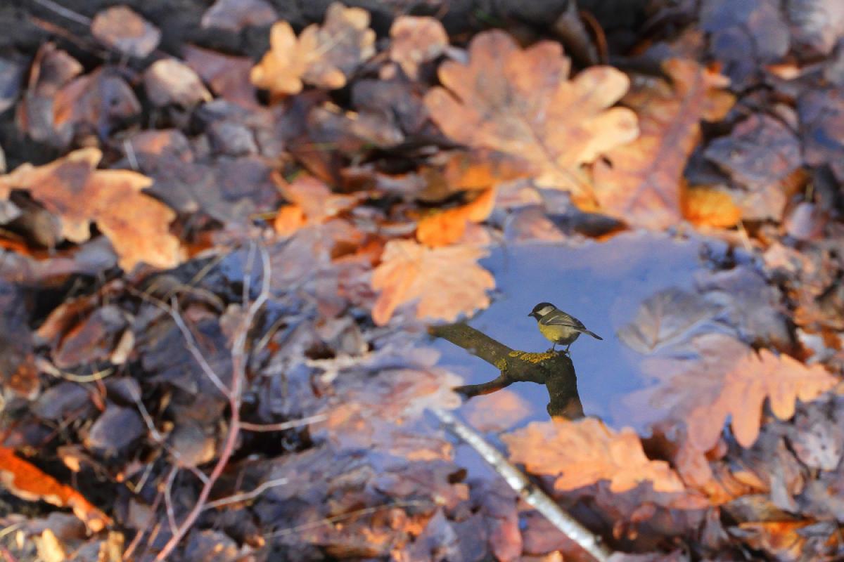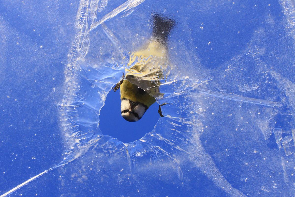 This series shows the unique look at the two species of wild birds - a blue tit and a great tit. The first photograph shows the ground from a high perspective, with great tit's reflection in a puddle. The second photograph was taken from a very low perspective, under the ice. It shows the blue tit, while the background is a blue sky. These photographs are not photomontages. It is an unusual perspective, which places the bird in the centre of a "natural window" - the puddle or the hole in the ice.