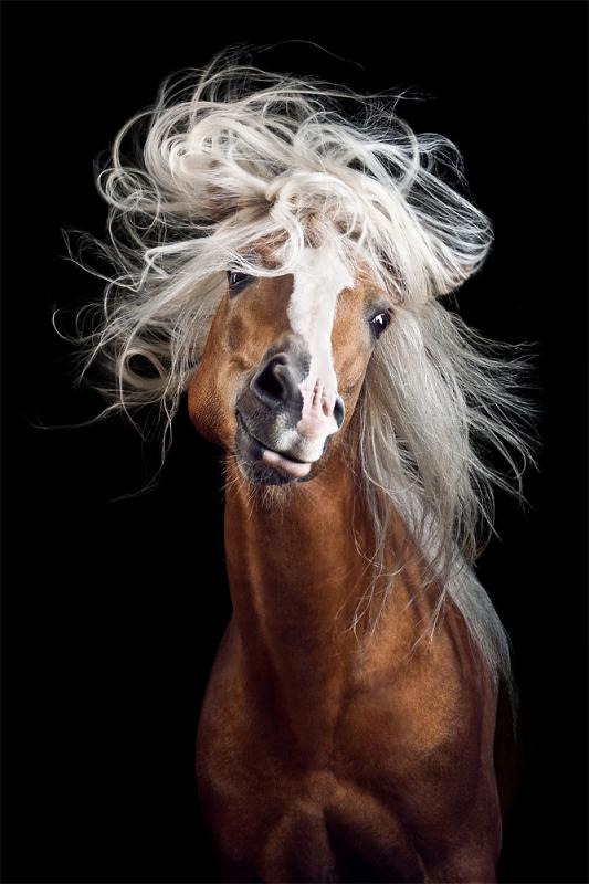 Mozart is a pure-breed Haflinger stallion, with the typical white flowing mane. My intention was to emphasize his magnificent head of hair. I wanted him to do some shaking movements, and I asked my assistent to tickle his ear. The result was a crazy shake and this bunch of hair. I did the photo in a studio and the challenge was to let Mozart do the shake exactly in the right position between the lights.