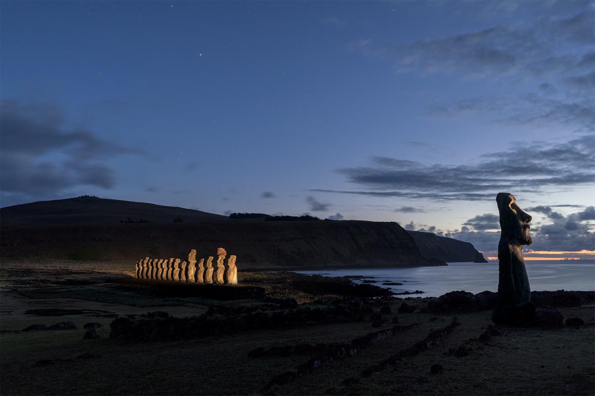 The Mysterious Moai statues at Ahu Tongariki on Easter Island at dawn. The lights of the approaching car painted the statues in the dark and created this interesting effect.