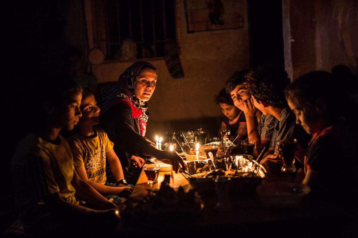Gaza, Beach Camp: Amal breaks the fast with her 7 children. Her husband left in Egypt and never returned. Having few means, she can not afford a generator or register on a generator of a particular. Her only source of light source when there isn't any electricity is candles or leds when it's recharged, on June 15, 2017.