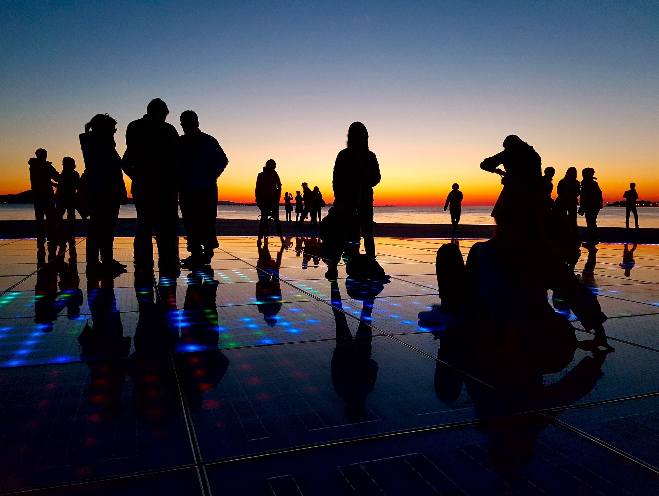 A group of people gathering around an installation to witness the setting sun over the coast of Adriatic Sea in Croatia.