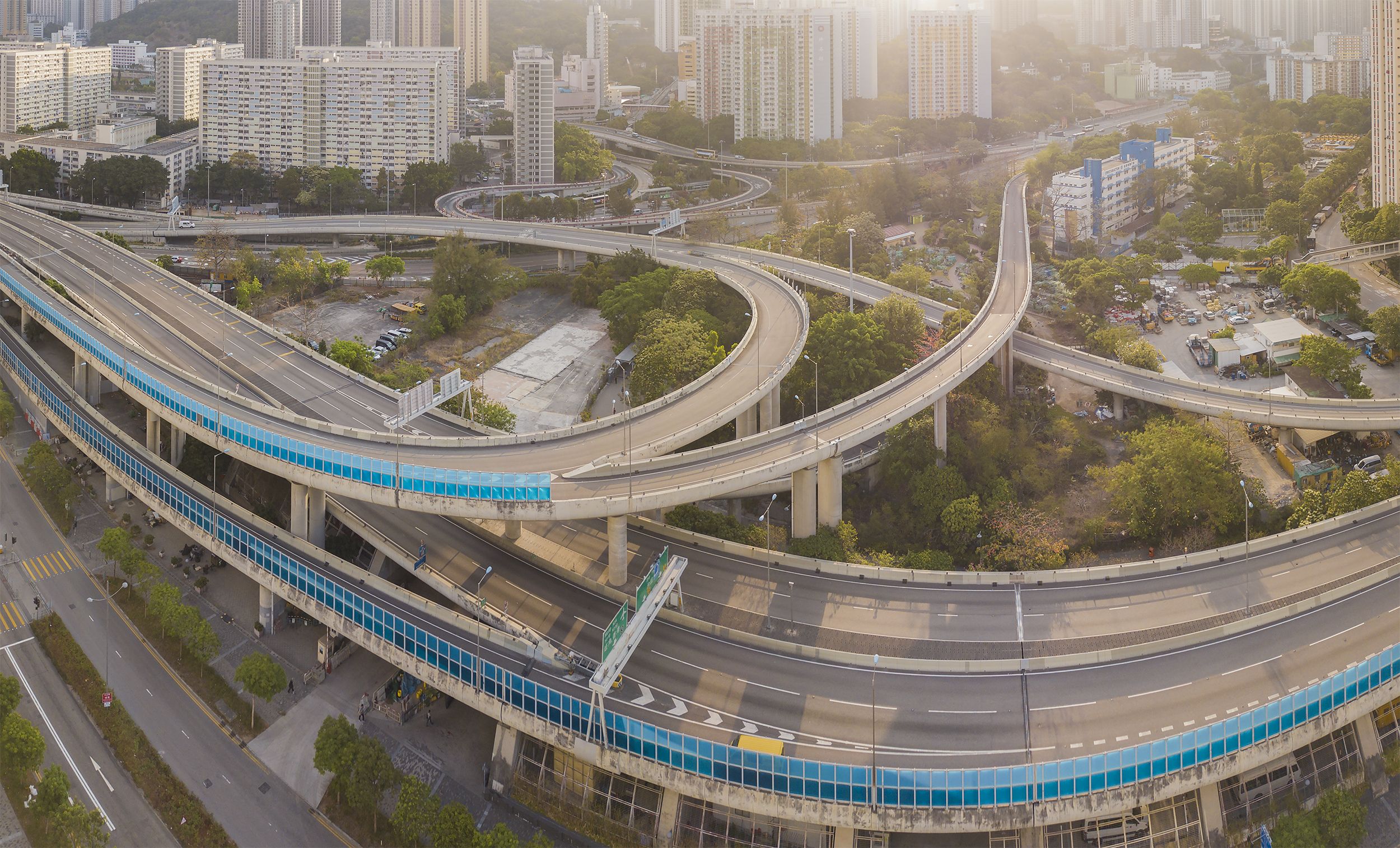 This is a flyover system in Hong Kong. Unlike other metropolitans, the flyover systems in Hong Kong are not so complex and huge in size due to lack of space. Nevertheless, the distortion of lens exaggerates the viusal effect and creates a stronger pattern.