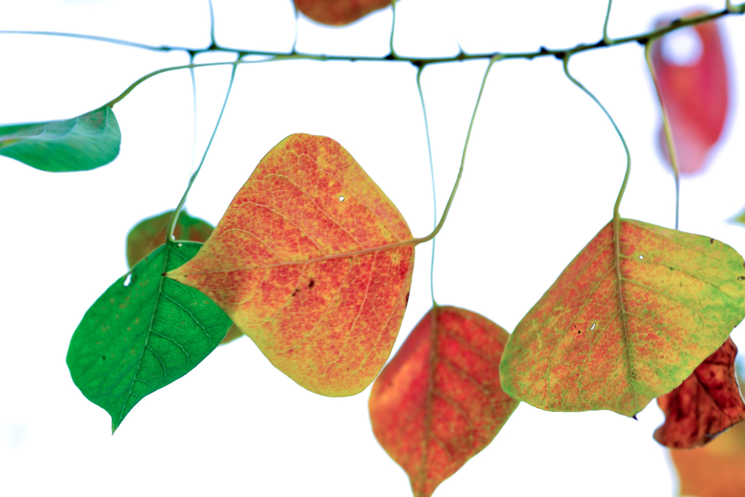 木子树(拉丁学名:Sapium sebiferum (L.) Roxb.)叶入秋后就变红了,挂在很细的枝条下的各种颜色和姿态的叶,就像五线谱中的音符,它们标示着秋天到来了。Muzi tree (Latin name: Sapium sebiferum (L.) Roxb.) after the autumn leaves turn red, hanging on a very thin branches of leaves of various colors and attitude, just like the notes read music, they marked the arrival of autumn.