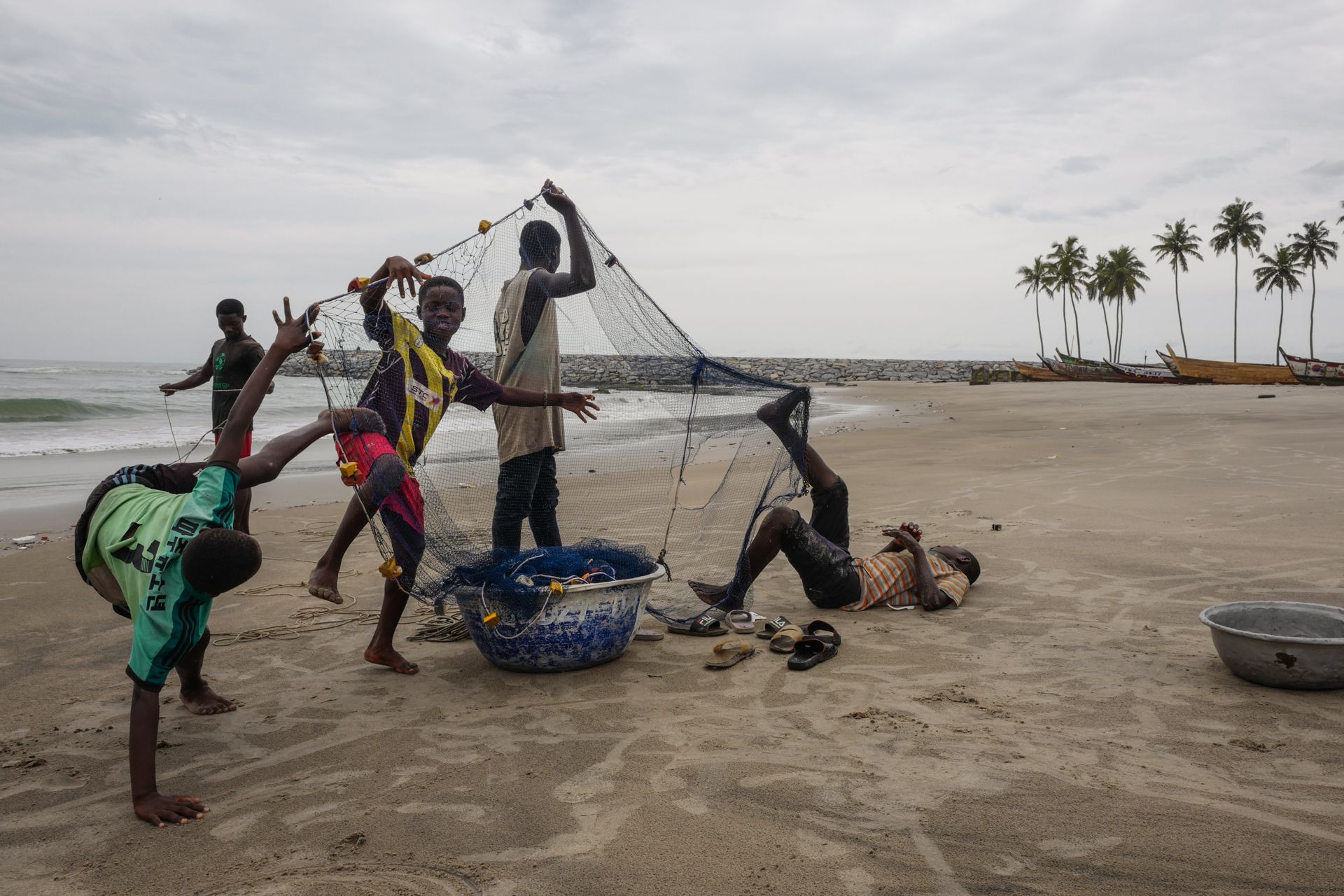 A fishermen family. Elders work while children play. Ghana, Elmina 2018