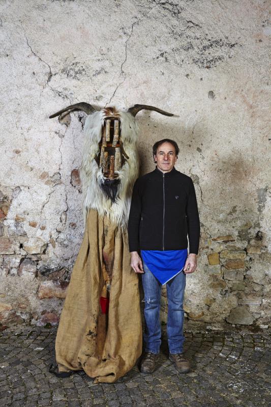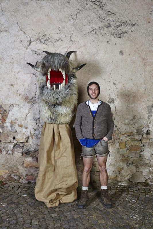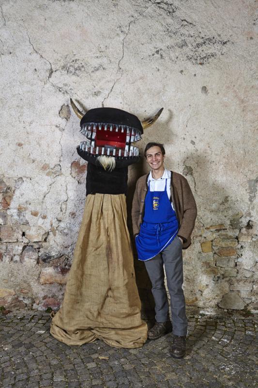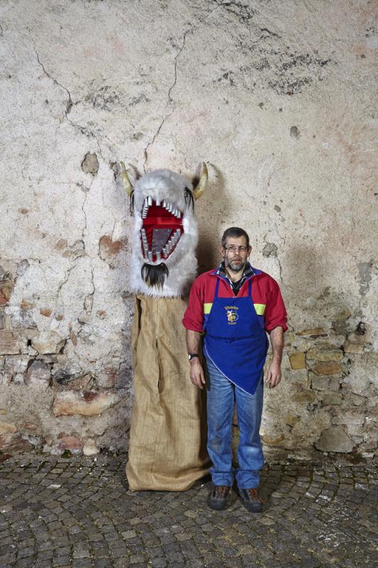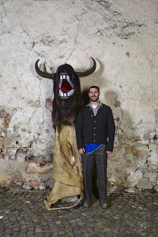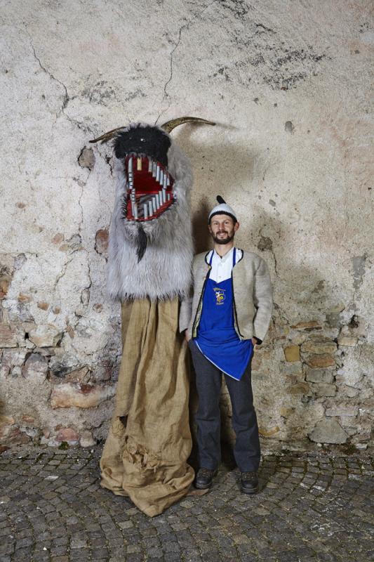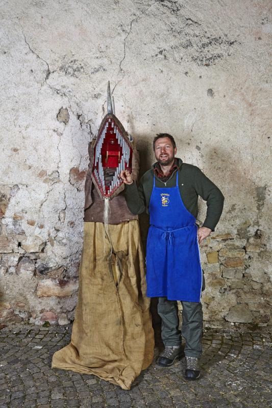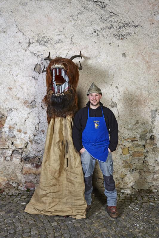 In Tramin (Nord of Italy), one of the most remarkable and oldest carnival traditions of Tyrol has been preserved: the so-called “Egetmann” parade. This carnival parade takes place only on Shrove Tuesday in odd years. Already weeks before this big event happens the whole village is in uproar. One of the most outstanding and at the same time most mysterious figures of Tramin’s carnival tradition is the “Schnappviech”, also called “Wudele” by the inhabitants of Tramin. From two-year-old boys to grown-up men, everyone slips under the sack of these creatures, which can reach a height of up to three meters. There exist many speculations where these legendary figures come from and why only in Tramin they have survived and developed further. What is known from many elderly Traminer – how the inhabitants of Tramin are called – is that the “Schnappviecher”, like many other figures of the Traminer carnival, stand for the expulsion of winter spirits and the welcoming of spring spirits. Dr. Josef von Elzenbaum who is a so called butcher of the “Schnappviecher” explains further: ‘This tradition starts each year on the 5th of December with the dangerous winter demon called “Krampus”. As the forces of nature are much stronger, people tried their best to get along with them, partly by homage partly by stealth. They conjured vernal fertility gods to bring luck to themselves and others. All this is an extremely valuable cultural cycle that persisted until today. Butchers, accompanying the “Schnappviecher”, slaughter one of the wild creatures at each village fountain. The symbolic meaning of this ritual is obvious: the butcher represents the spring that kills the evil winter spirits. Thus, the important tradition for farmers can be seen as a symbol for the magic of springtime. It remains a mystery where the model for this strange figure comes from. The pronounced dragon head of the “Schnappviech” suggests a representation of a superhuman being that can be found in both religious imaginations and folk legends and myths.