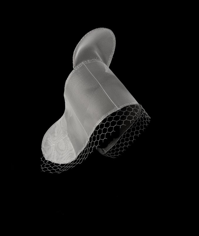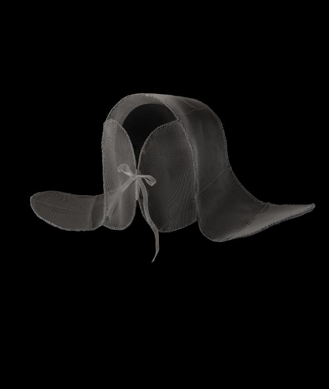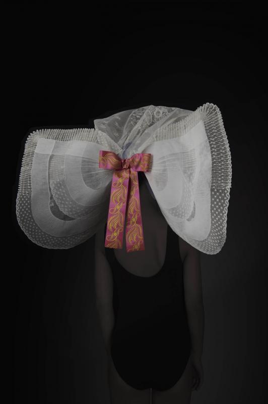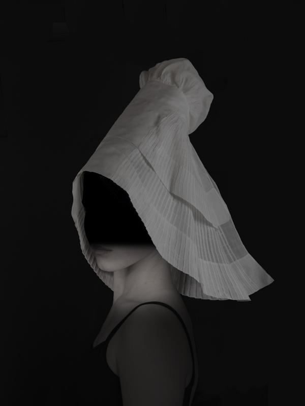 While exploring the collections of several Norman museums, I was able to admire and then photograph Norman women's headdresses and needle and bobbin lace ornaments. I was fascinated by the quality of these subtle elaborations that are the work of modest women who remain in anonymity. My photographs are a tribute to this intense and demanding work of patience. These women, while humbly continuing their domestic work, were able to transcend their condition by expressing their creativity. They left us these beautiful pieces. They are, for me, ordinary fairies, magicians of everyday life, they have brought into their homes, through the perfection of their technique, the taste of beauty, respect for values associated with creativity. To evoke the difficulty and the beauty of this transcendence, I began to make a set of caps using ordinary metallic frames: sheep gratings, pantry grills, etc. Cut-outs, montages, lacings, quilts: my archaic reminiscence assemblages evoke the exoticism of the shapes of these headdresses, sometimes so strange that they seem to come from elsewhere, powerful and magical. These creations are photographed on a black background, they complete a corpus of images where pass silently headdresses and pieces of lace. Shadows, ghosts, elves, bodies and faces present or suggested remain suspended in an atmosphere of meditation. It seemed important to me to put back into the current of contemporary artistic creation these testimonies of an intimate experience related to the history of the condition of women.