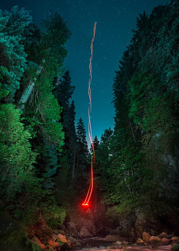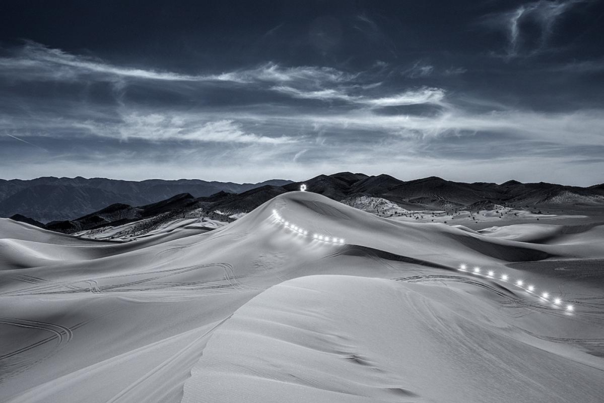 Ascension of Dumont Dune. 36"x54” Edition of 9 Here I entered the frame, became the light and began the journey to the top. An ideal journey of one. No decent, only steady ascension with massive leaps leading to the apex. Vertical Sync. 30"x42” Edition of 9 Another journey, this time one of partnership. Two lights revolve around each other playfully in vertical accent. A third light between them represents total sync and connection to the stars above.