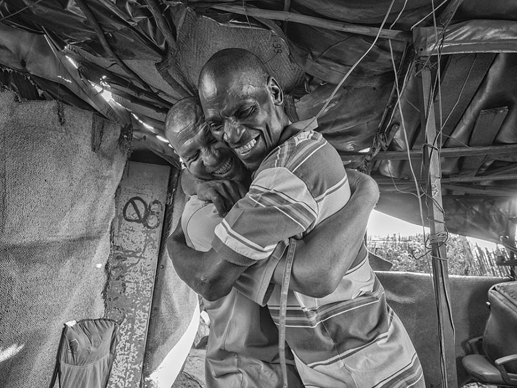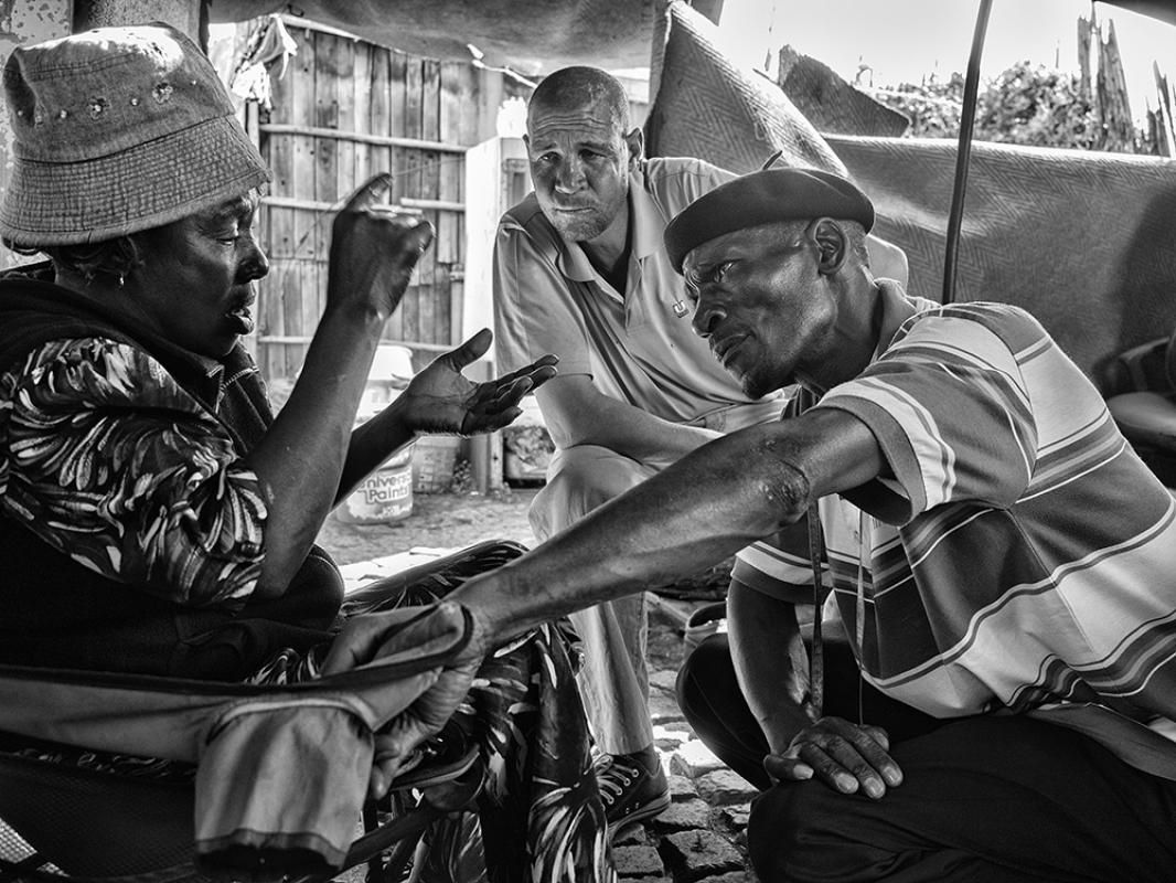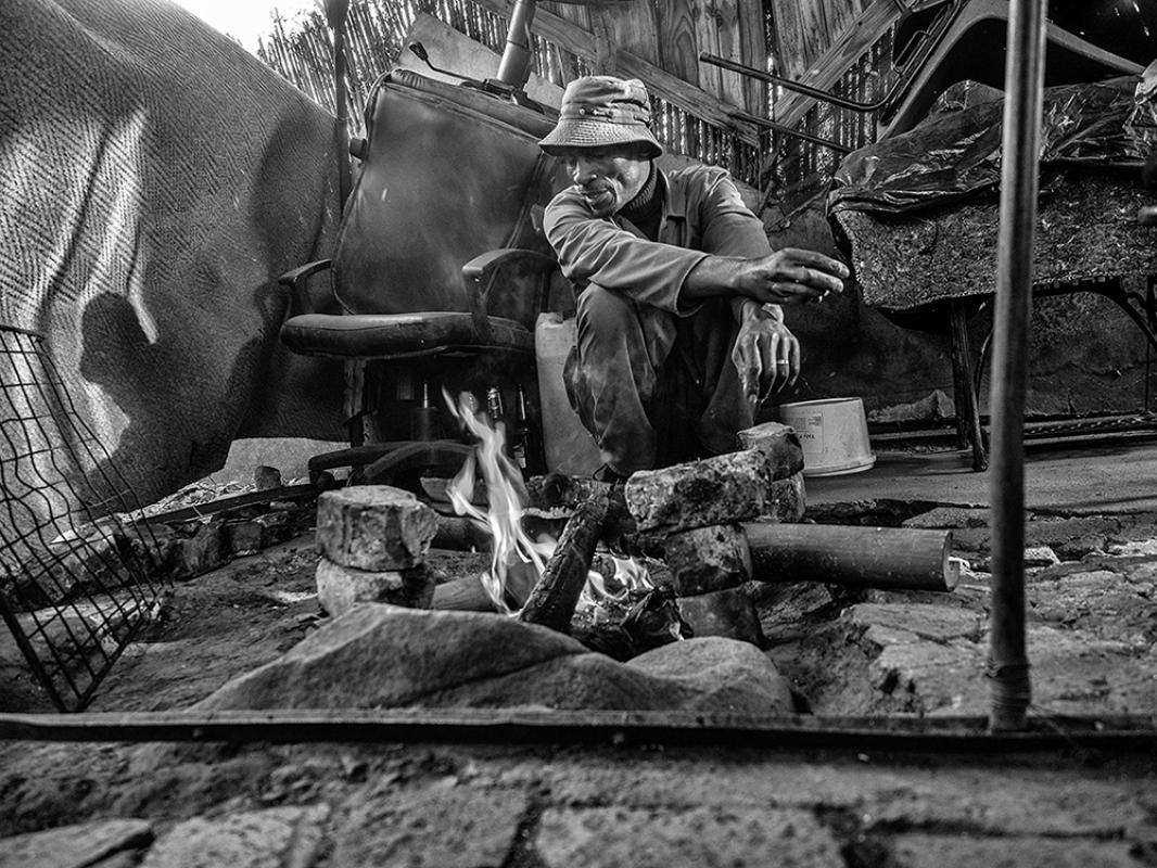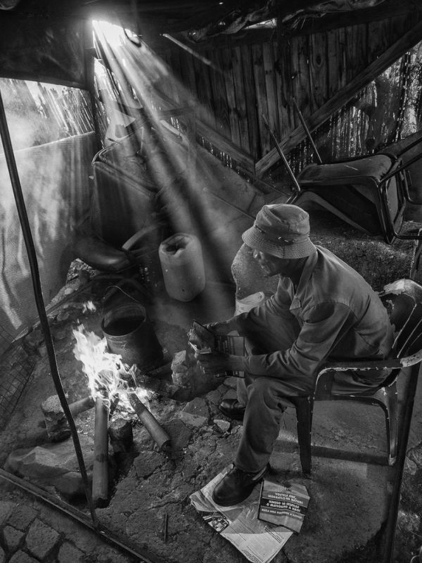 Tinker Tailor is part of a long-term photographic and narrative project exploring home and belonging in Woodlane Village, an informal settlement located in the affluent suburb of Moreleta Park in Pretoria. The village is called "Plastic View" by the surrounding homeowners who describe the place as a hotbed of crime and pestilence. From 2011 to 2014, I undertook doctoral research exploring how residents created home and belonging through the stories they tell about their lives. I have returned yearly since then to document the shifting realities in the community. Over this period of time I befriended Donald Banda, a resident in the community. Tinker Tailor reveals intimate moments from Donald's life as he navigates the complex realities of South Africa. Donald Banda is the Chair of the Executive Committee of Woodlane Village as well as a tailor. Donald's time in the community is divided between repairing people's clothing and addressing the concerns of residents. He has mixed feelings about the camp, calling it a "home and a no man's land."