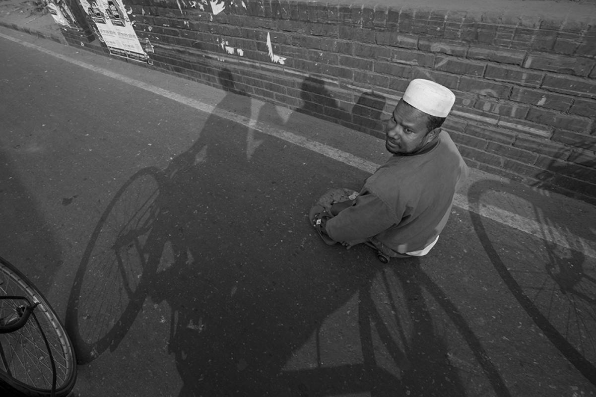 A handicapped man riding on skate board on the busy road at the heart of Dhaka city centre