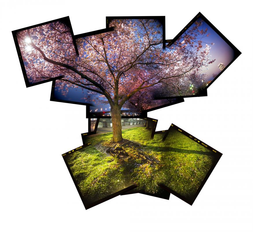 A single, composite image composed of exposures made across two separate rolls of film, one roll of the top half of the tree at twilight, the second roll exposed the next morning of the bottom half of the tree at sunrise.
