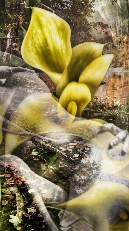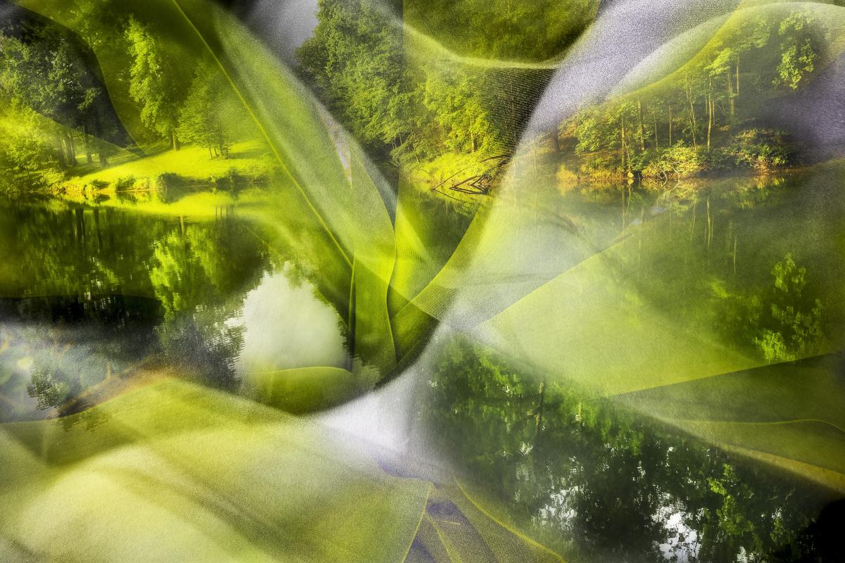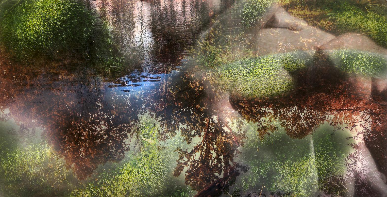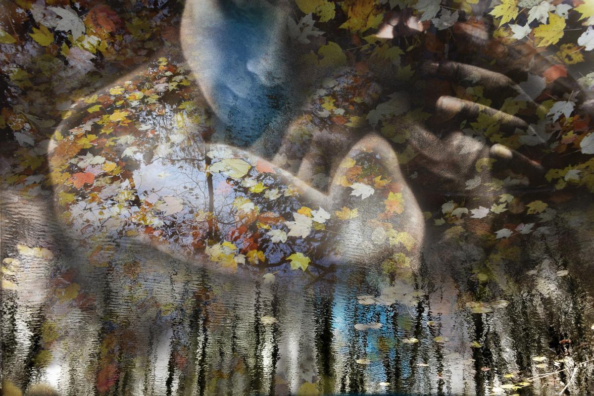 In this series Spartana creates dreamlike landscapes by combining the human form with multiple organic elements. It continues a concept from his earlier study, “Human-Nature,” which explored the interplay of black and white forms overlaid with details of flowers. Here, he expands the use of natural elements to include landscapes and details of nature during times of growth and decay. Spartana says they are “like the strata of memories. The mirrored surface of water reflects skylight into a hidden hollow, revealing something new, yet familiar. The patterns of leaves or sedimentary rocks naturally suggest intricate tattoos. These compositional layers of elements give the viewer reason to look closer, to see beneath the surface. The interplay between the human form, organic elements, and the landscape create incredible beauty for me, as they are intertwined on earth, coexisting as one. We are of the earth, and how we treat our environment affects all of us.”
