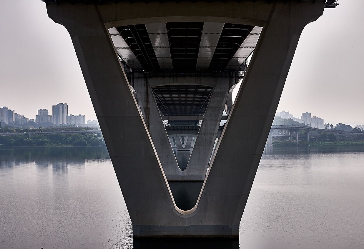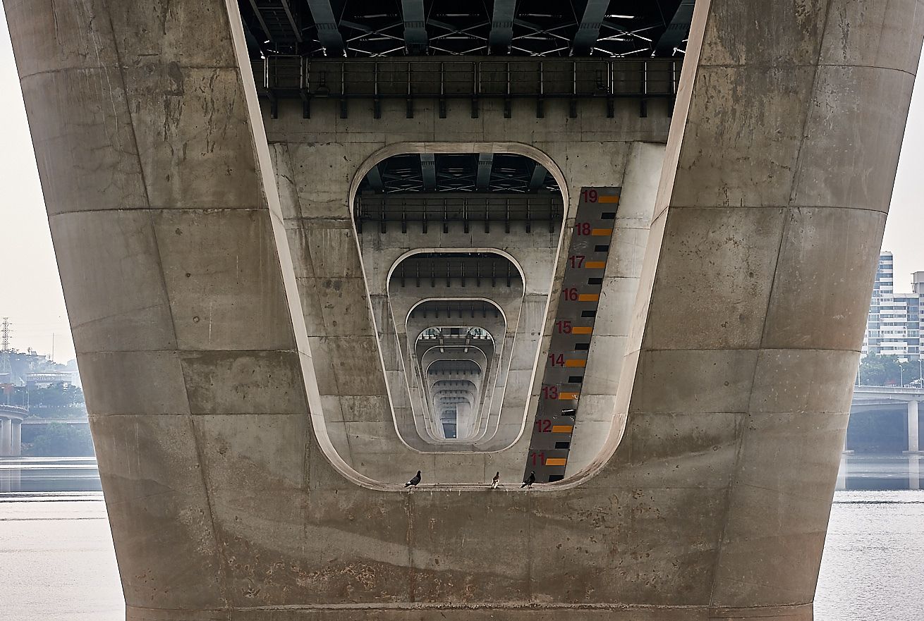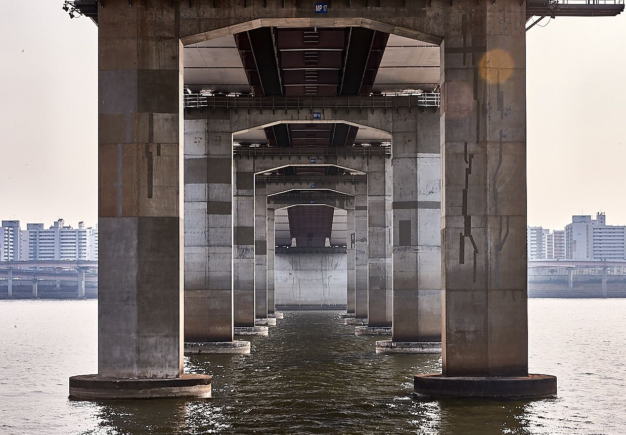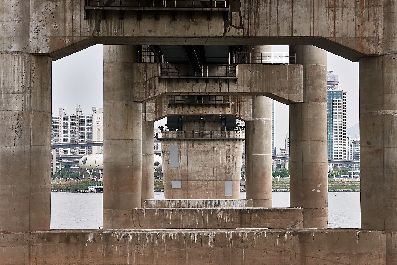 Seoul Bridges is a photographic work about the 27 bridges crossing the Han River in Seoul's metropolis. I was fascinated with the monumentality and massiveness of the supporting structures through pillars and beams and the receding perspective that they generate. Each bridge has its distinctive design qualities which create different vistas. The grandiosity of the supporting structures in the river and the spaces they create also generate a mysterious quality that inspired me to conduct the work, as we no longer see their main function, which is to connect people across the metropolis.