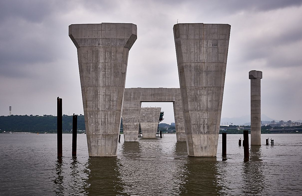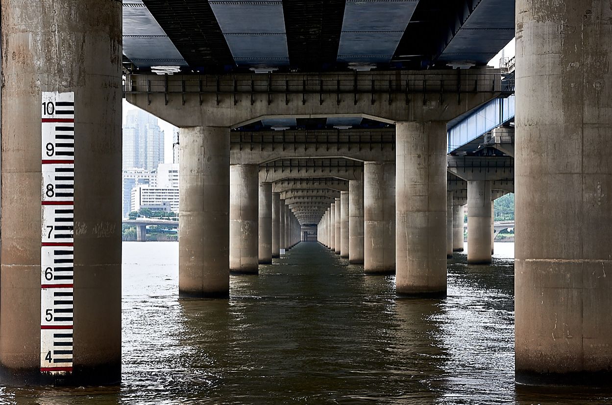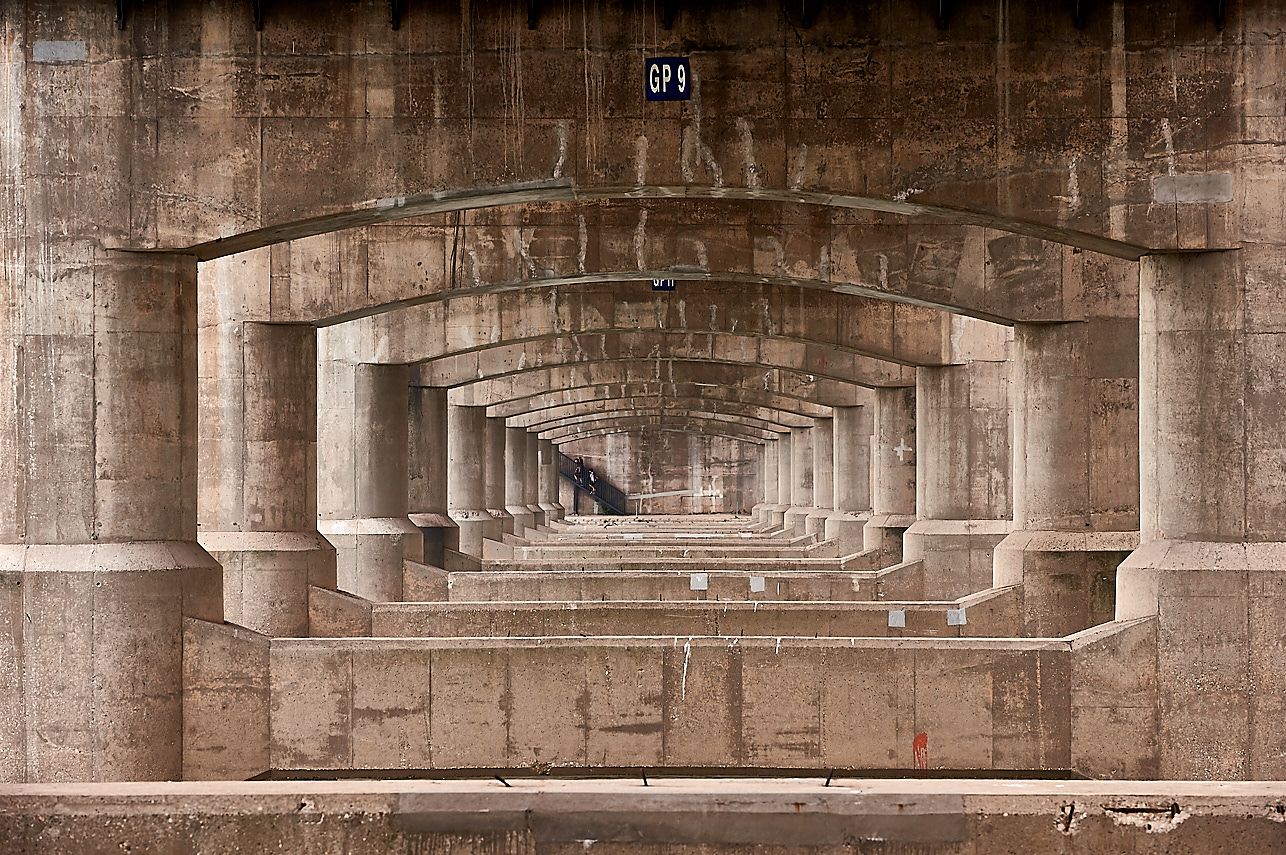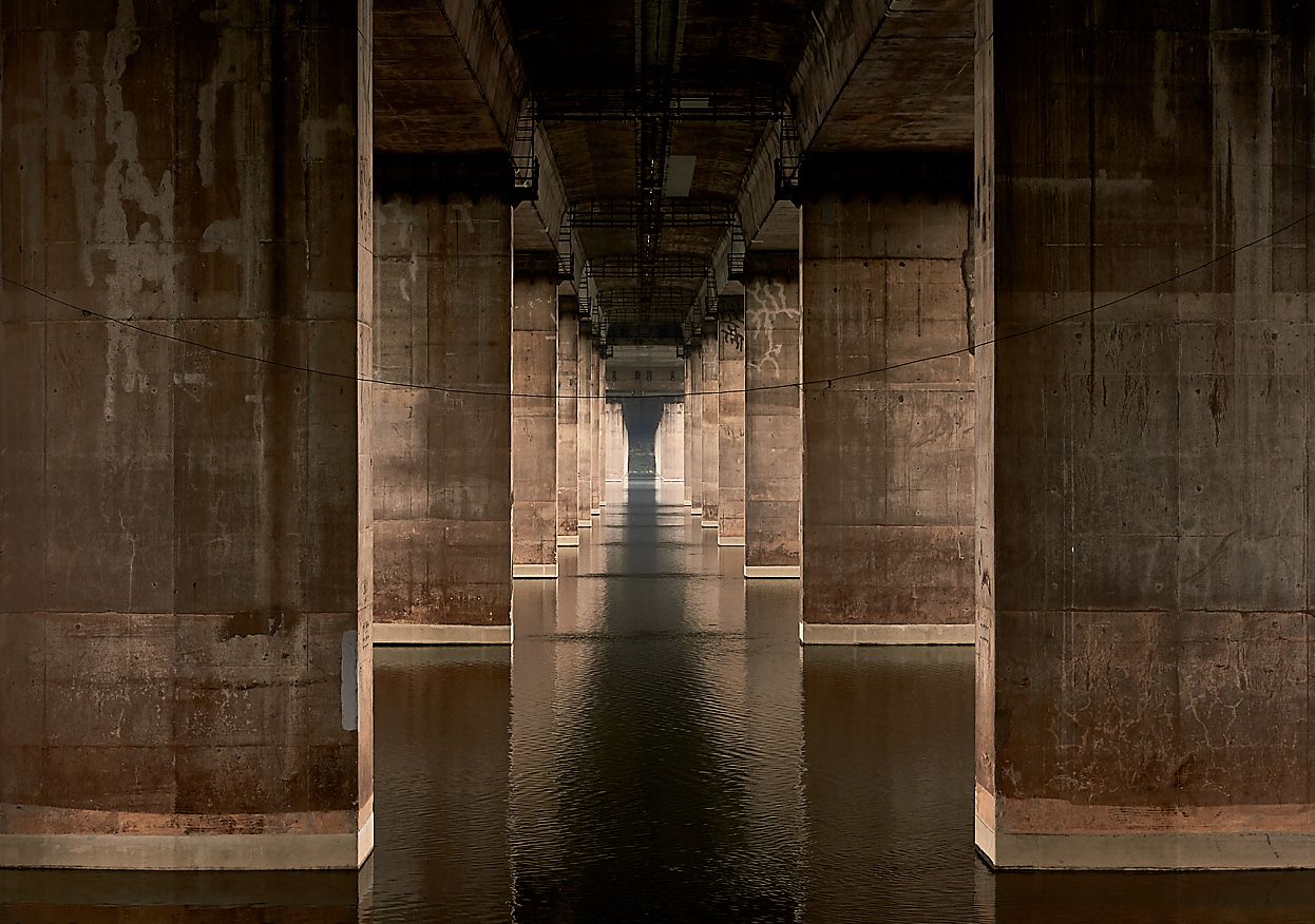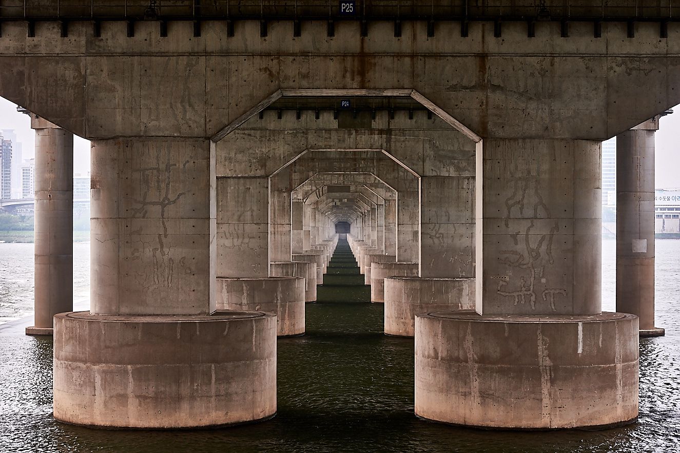 Seoul Bridges is a photographic work about the 27 bridges crossing the Han River in Seoul's metropolis. I was fascinated with the monumentality and massiveness of the supporting structures through pillars and beams and the receding perspective that they generate. Each bridge has its distinctive design qualities which create different vistas. The grandiosity of the supporting structures in the river and the spaces they create also generate a mysterious quality that inspired me to conduct the work, as we no longer see their main function, which is to connect people across the metropolis.
