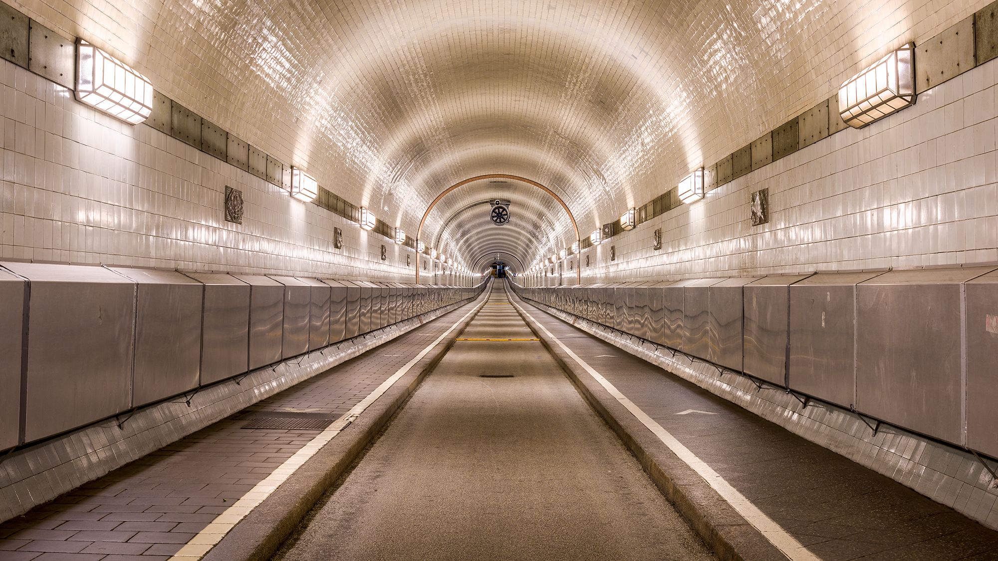 The old Elbtunnel in Hamburg, Germany was opened in 1911 and considered a technical sensation in engineering. The 2 single lane vehicle tunnel tubes connected the main city with the port and shipping docks in Hamburg harbor - the second largest harbor in Europe. Huge lifts would lower the cars from street level and back to the surface on the other side. The tunnel sits 80ft below the surface and runs under the river Elbe - which frequently accommodates the Queen Mary. The tunnel is still in operation today, though mainly used for nostalgic reasons.