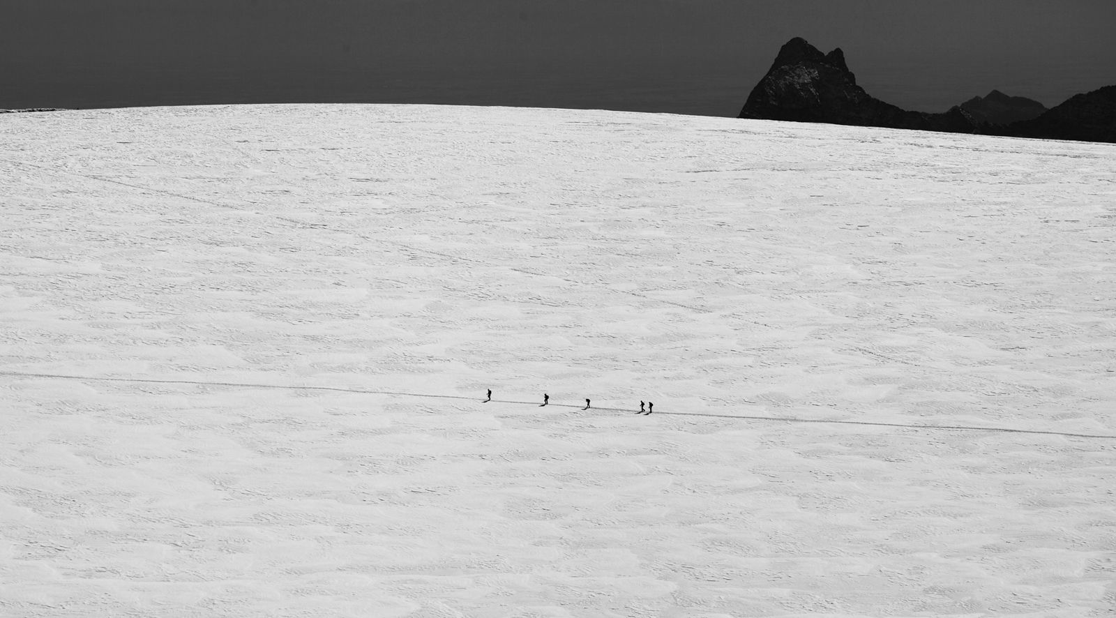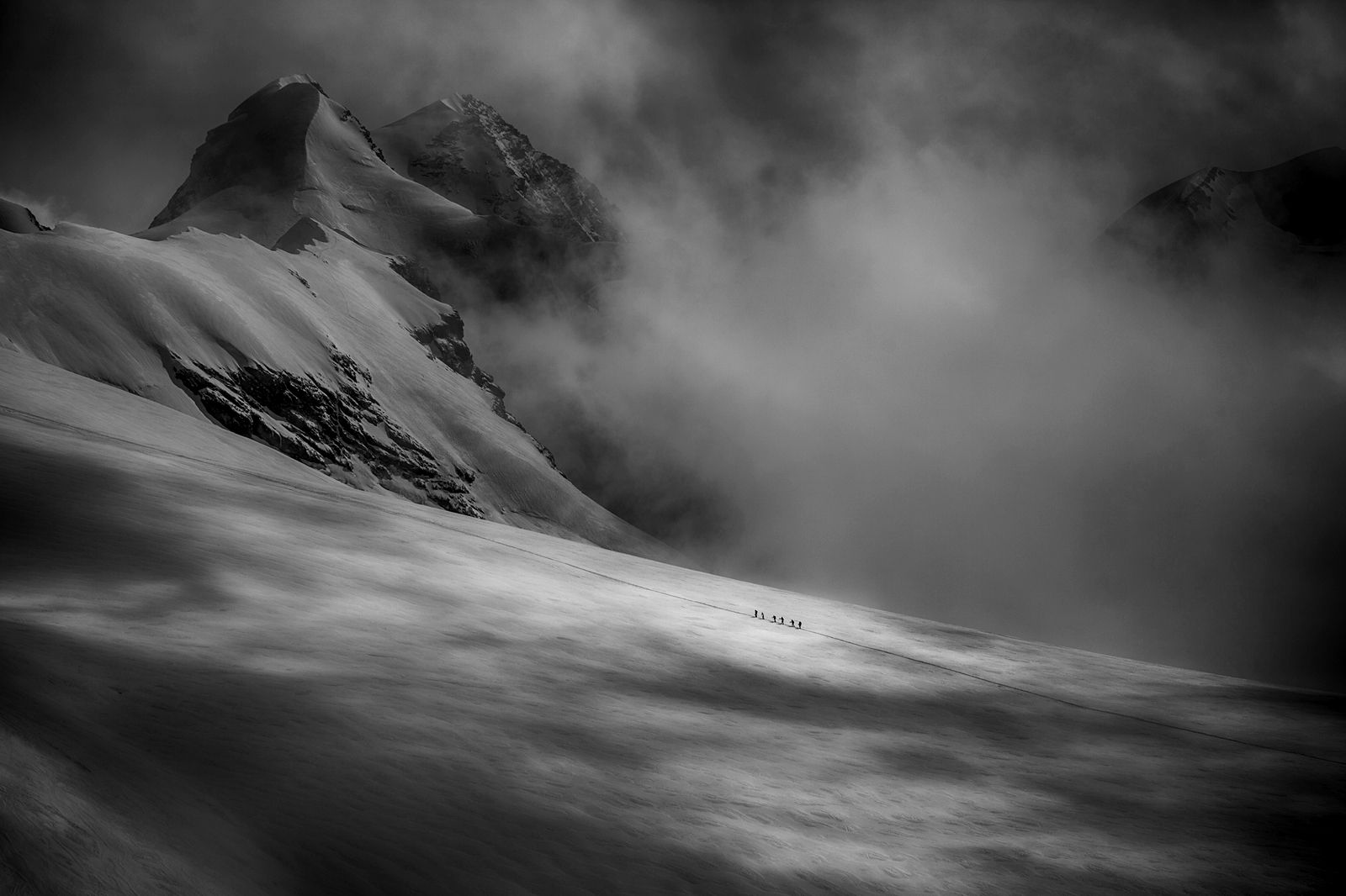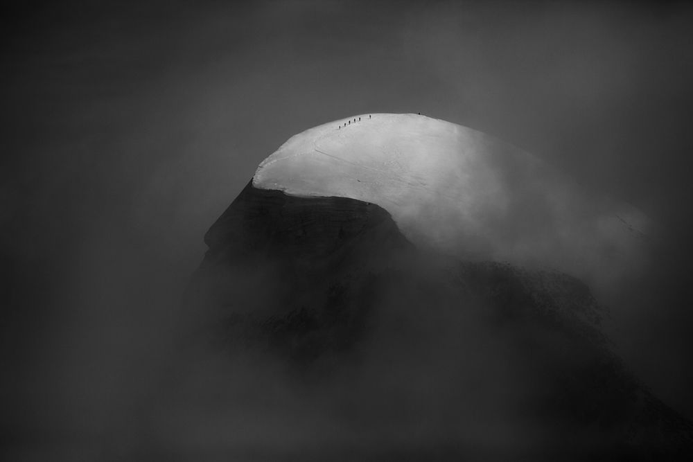 Series of pictures taken in autumn 2017. The group of climbers approaching the top of Breithorn in Swiss Alps during the weather change.