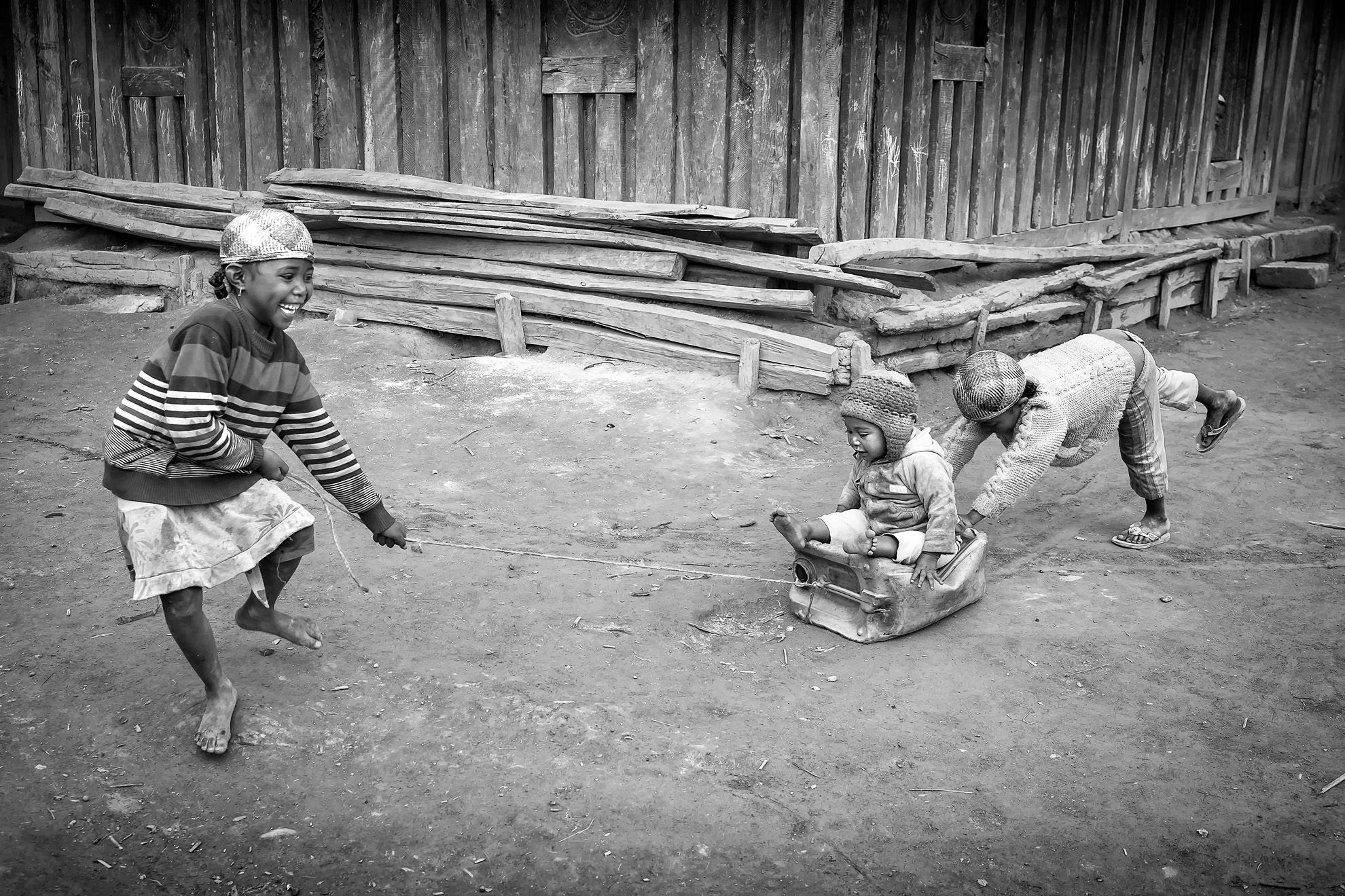 People in Madagascar live on less than 1 euro per day, which means that Malagasy children can not buy toys. Children self-manufacture their toys from waste materials using a good dose of imagination and ingenuity. The fun and their desire to laugh show us that happiness is not consumer