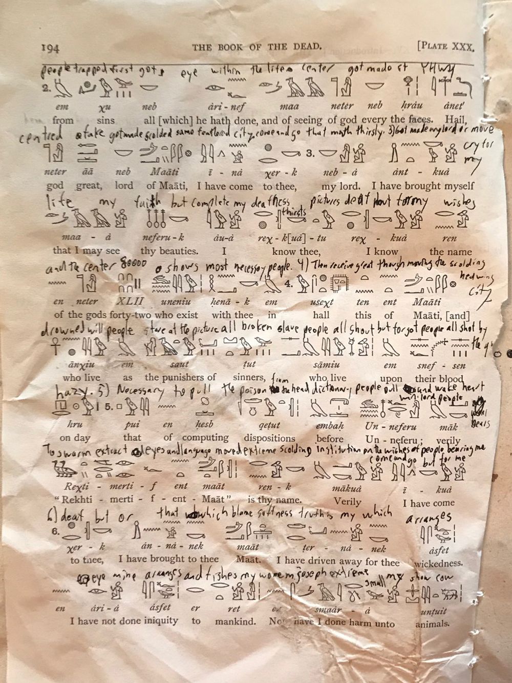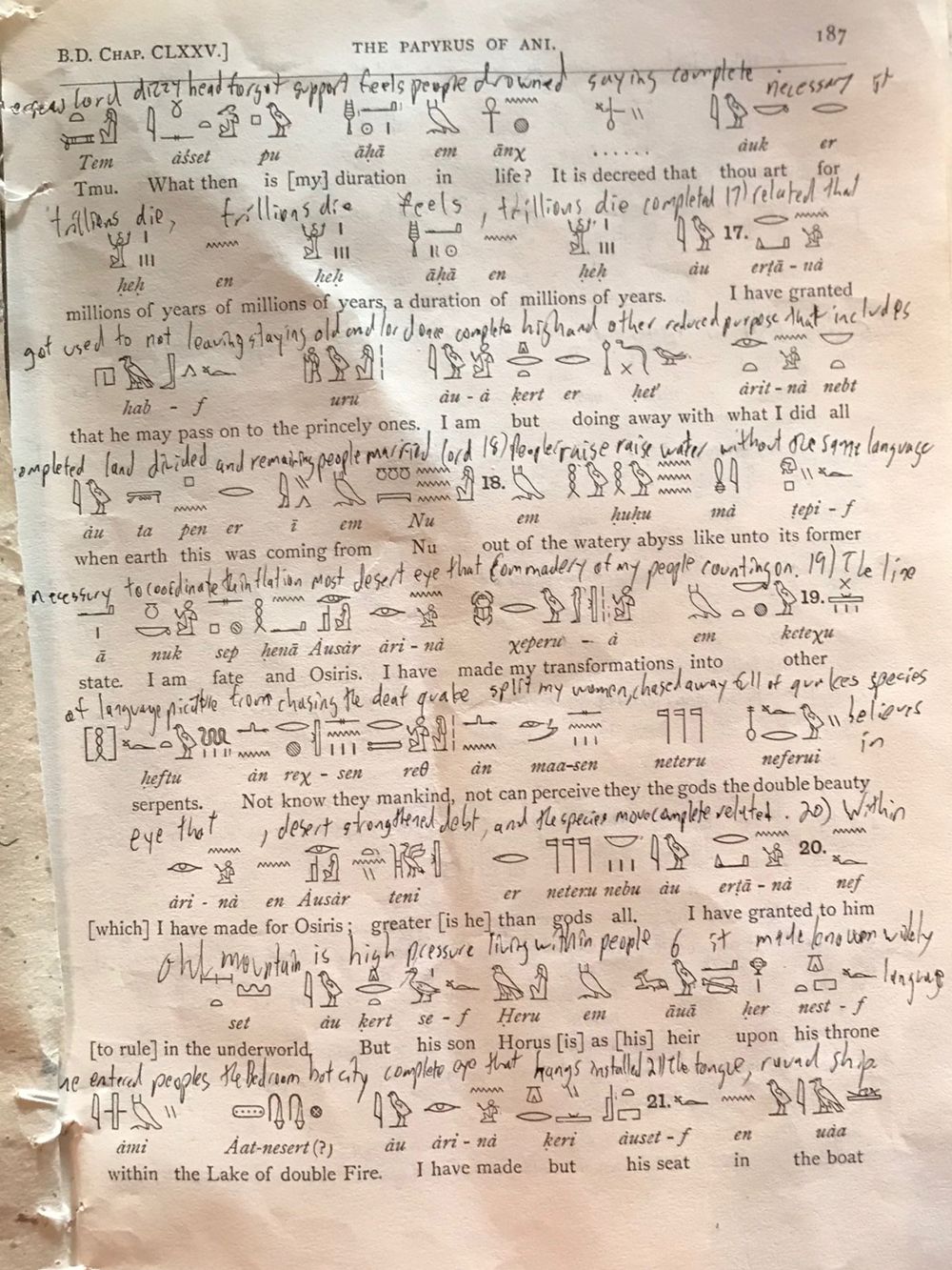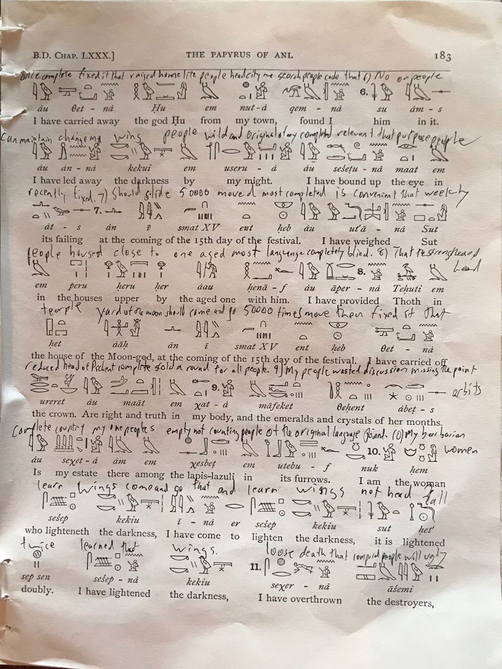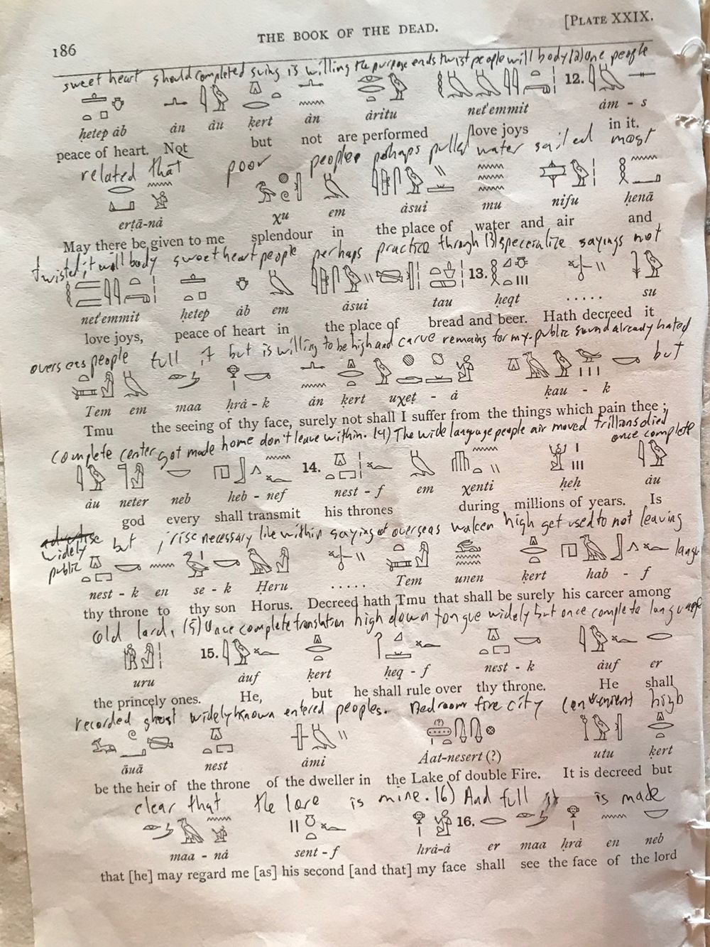 These photographs document the gradual decipherment of the Egyptian Book of the Dead. After studying the hieroglyphics for a previous series, Archetypal Writing, I helped to decipher hieroglyphics. The symbols for hieroglyphics turn out to be a phonetic and symbolic way of spelling out the ancient mandarin language as well as possibly other languages. The words spelled out by the hieroglyphics form a phonetic standpoint are quite clear. However, even after converting the hieroglyphics into the mandarin equivalent, because of the nature of mandarin chinese, being full of puns, is mutable.