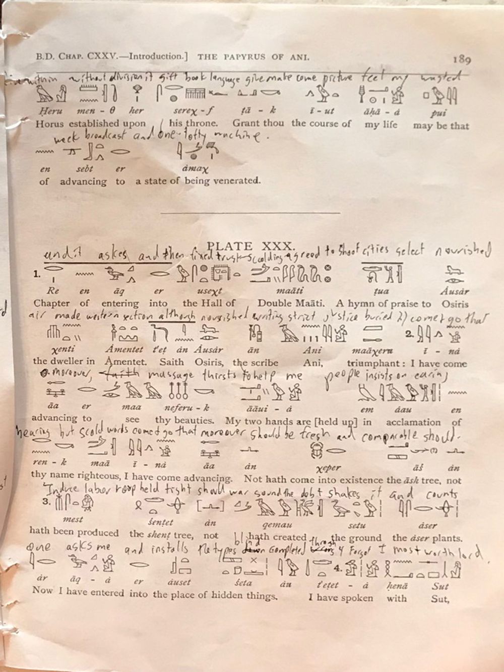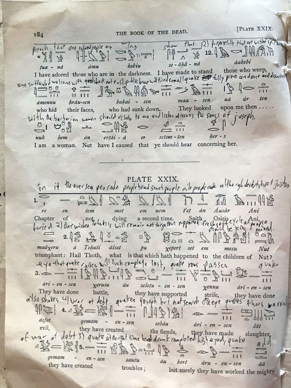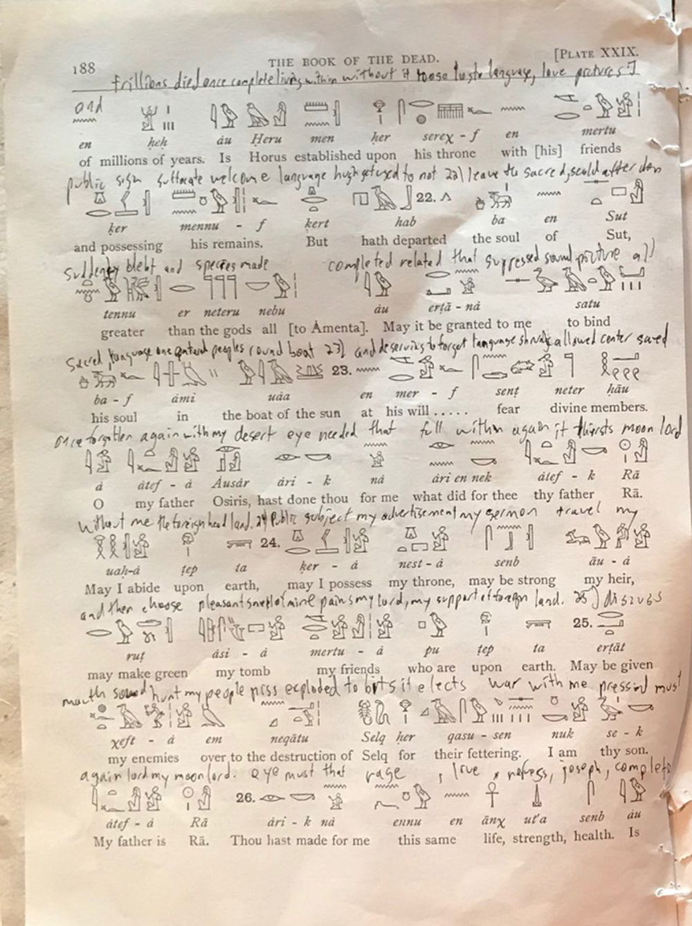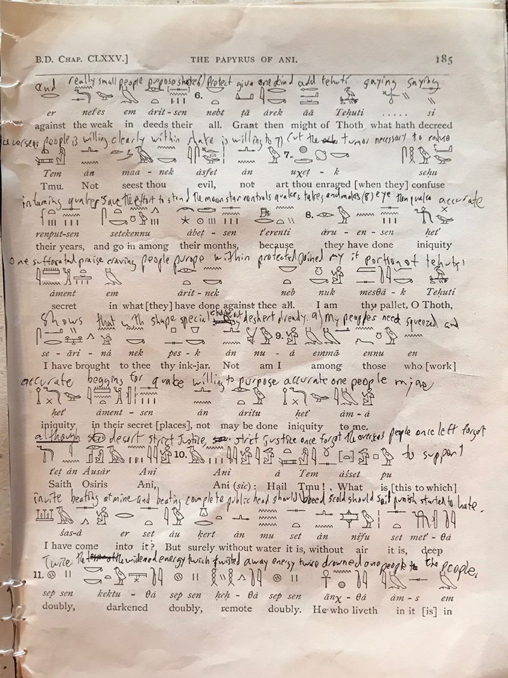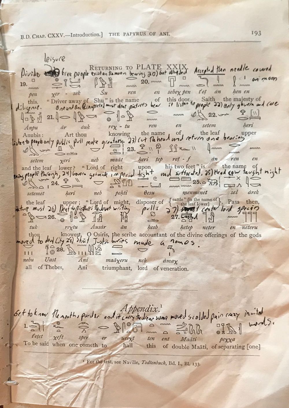 These photographs document the gradual decipherment of the Egyptian Book of the Dead. After studying the hieroglyphics for a previous series, Archetypal Writing, I helped to decipher hieroglyphics. The symbols for hieroglyphics turn out to be a phonetic and symbolic way of spelling out the ancient mandarin language as well as possibly other languages. The words spelled out by the hieroglyphics form a phonetic standpoint are quite clear. However, even after converting the hieroglyphics into the mandarin equivalent, because of the nature of mandarin chinese, being full of puns, is mutable.