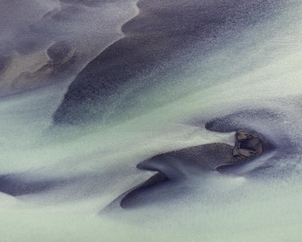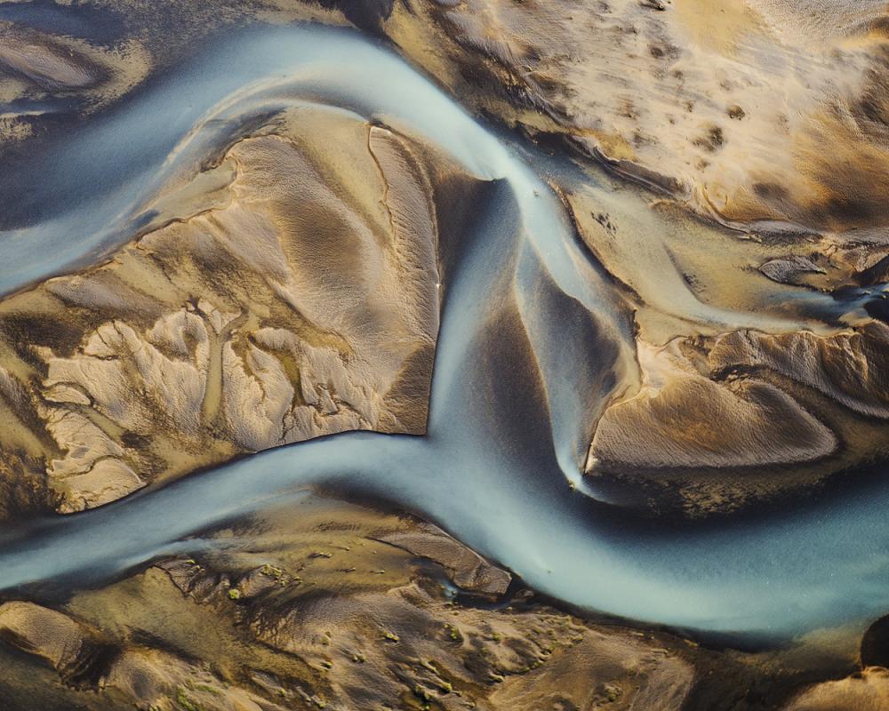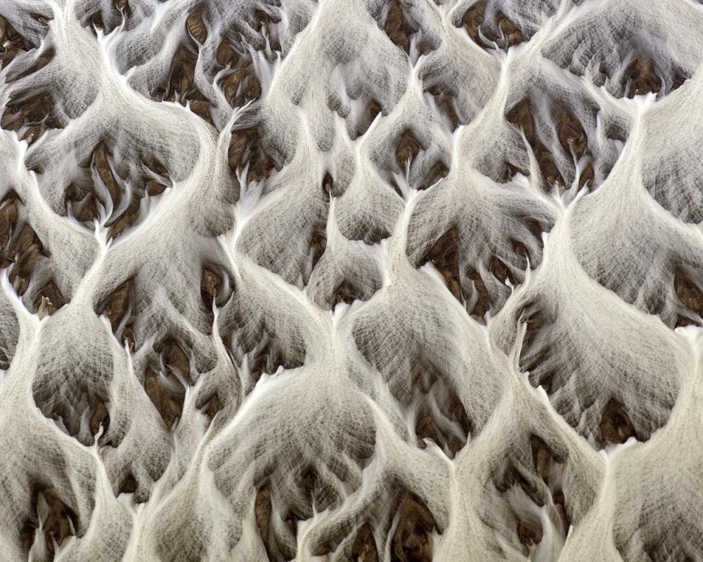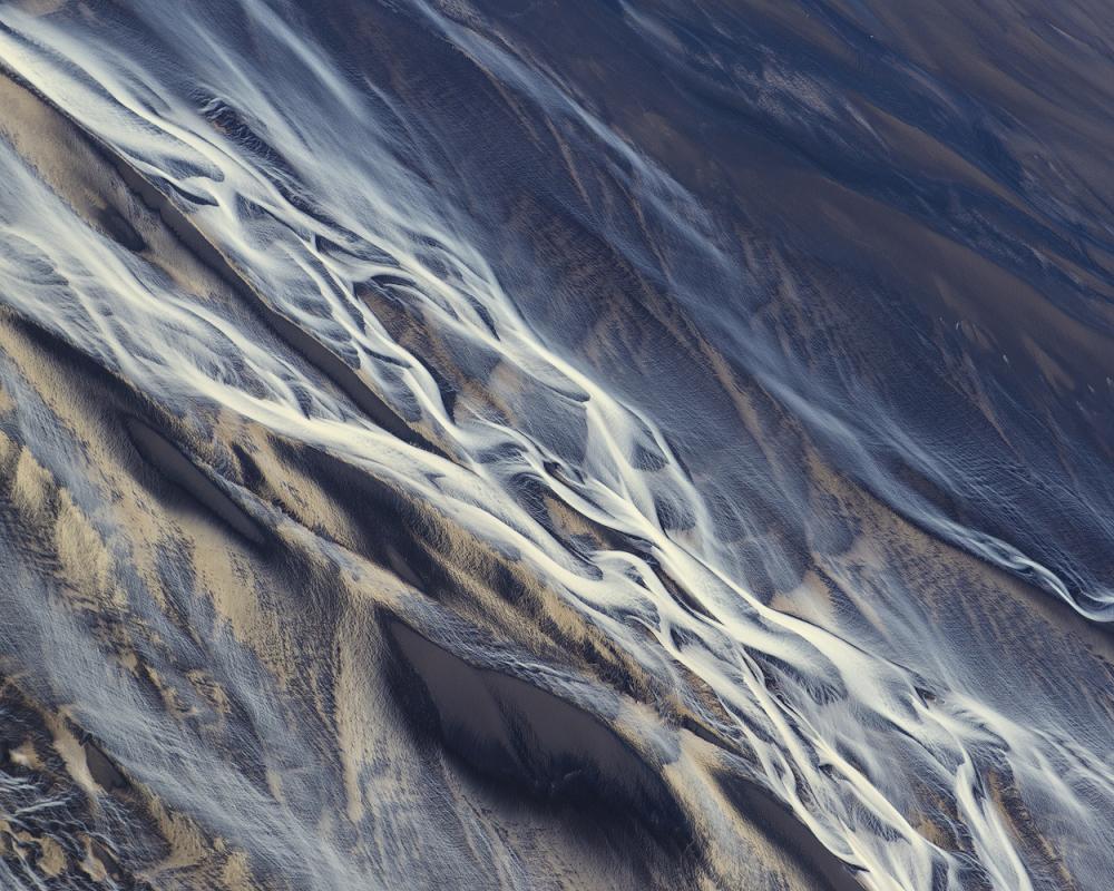 Aerial images of volcanic rivers captured at 900 feet from the open window of a Cessna aircraft. During summer season glacial melt water forms braided streams that looks like abstract painting.