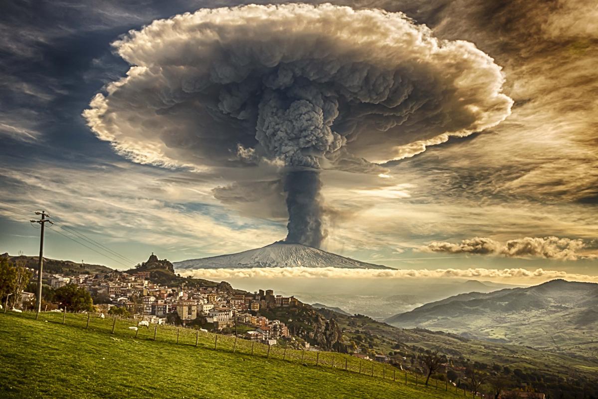 Eruption of the Etna volcano seen from the inhabited center of San Teodoro. The ash cloud looks like an atomic explosion of immense power and contrasts with the stillness of the small town.