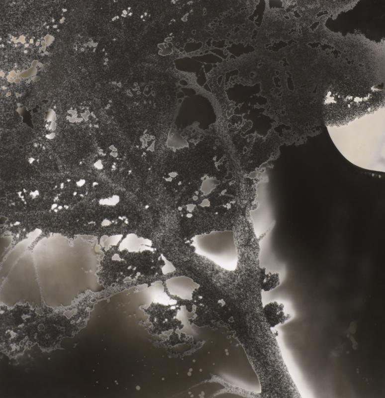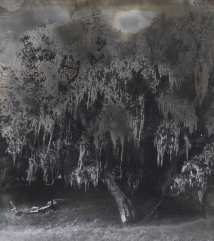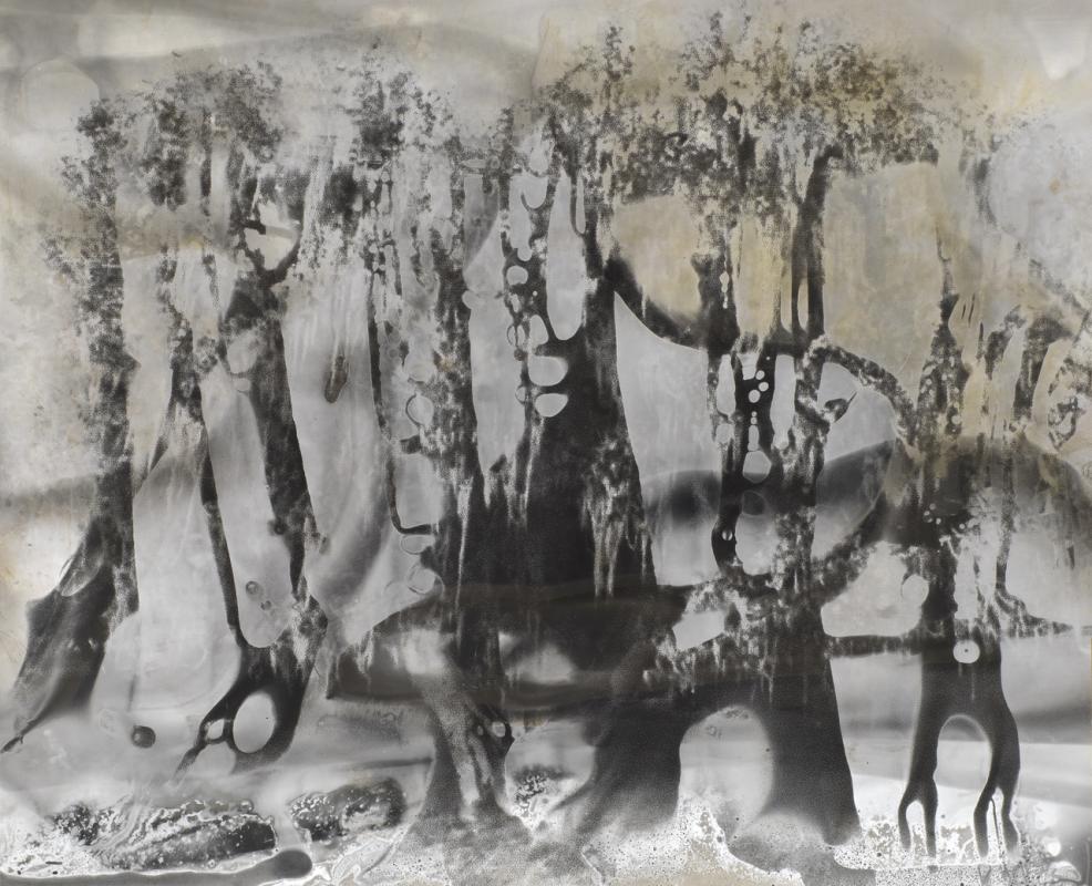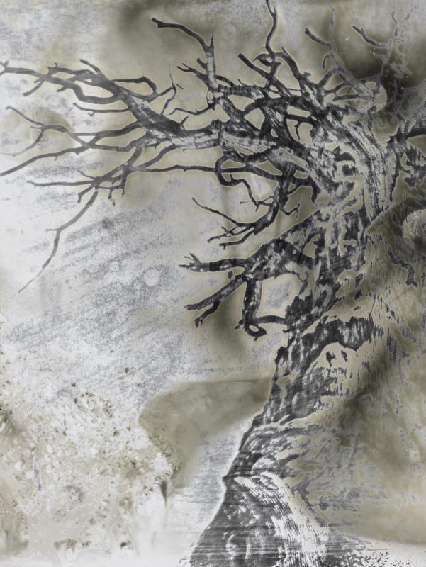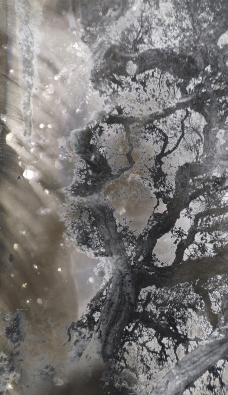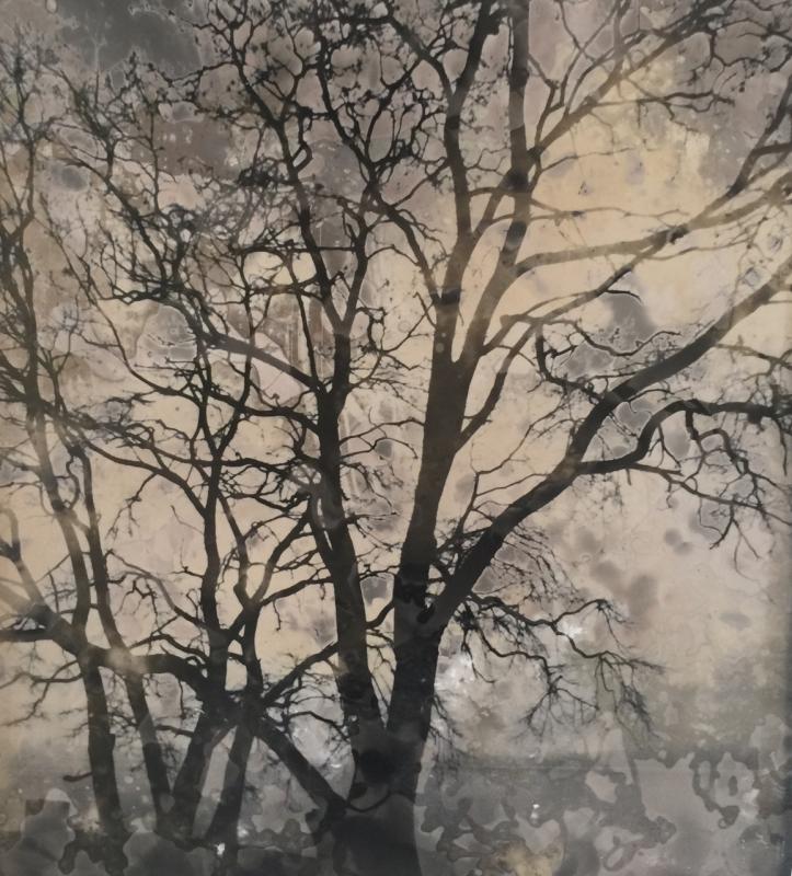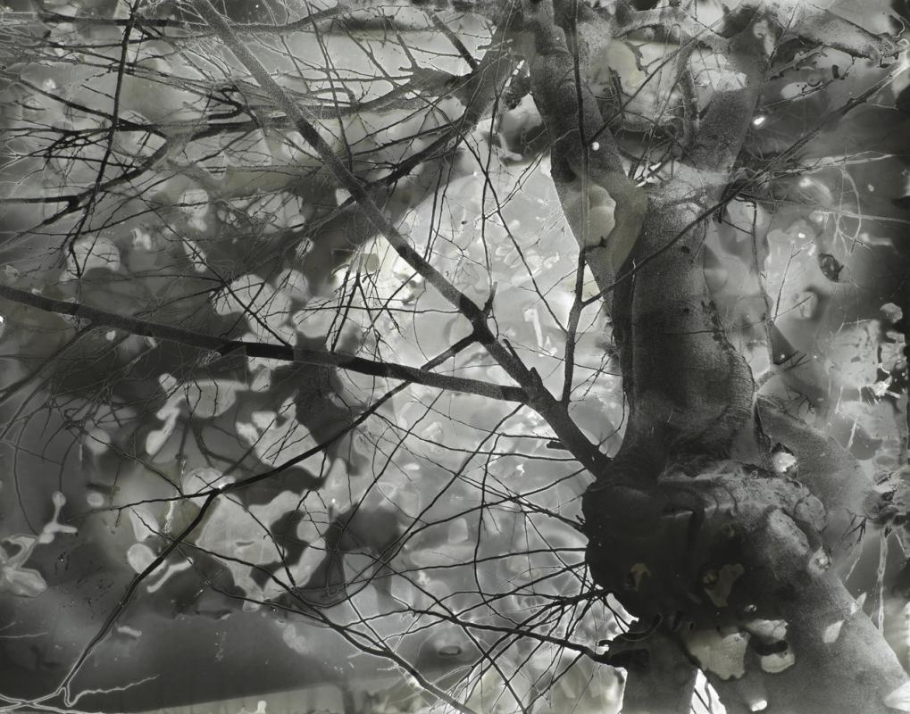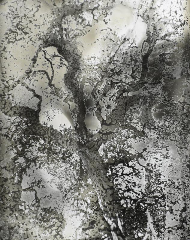 Intimate Conversation My love of trees inspires this work. My older sister and I played for hours under the protective canopy of the tall, stately trees of the Pacific Northwest. Even though we were young, we played with little or no parental supervision. Those were happy, carefree days. There’s something about trees that makes me feel safe and even nurtured. That youthful visceral experience with trees heightens my concern for the well being of the trees. These images push toward the edge of darkness exploring feelings of despair over heightened concerns over the effects of climate change on tree ecosystems. This is wet darkroom work. After exposing tree negative onto silver gelatin paper, I pour, spray, and drip developer onto the paper’s surface. The chemicals interact with the paper in unconventional ways. During an 8-hour period, I revisit the print in process many times adding chemicals as needed and trying out experimental ideas.