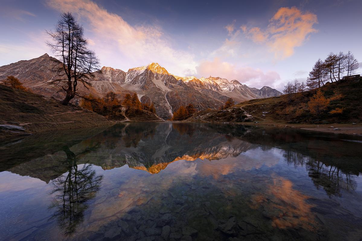 This is an alpine lake in Switzerland. The scenery in autumn is worth the hike, isnn't it?