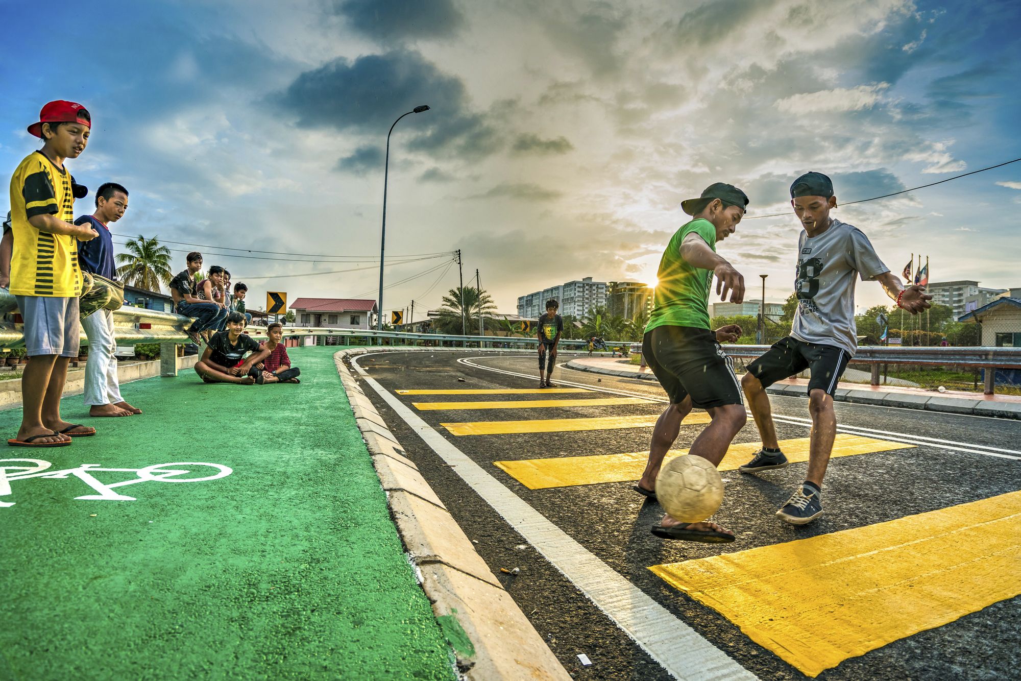 A group of teenagers play football in the rain on a abandoned highway in Sabah, Malaysia