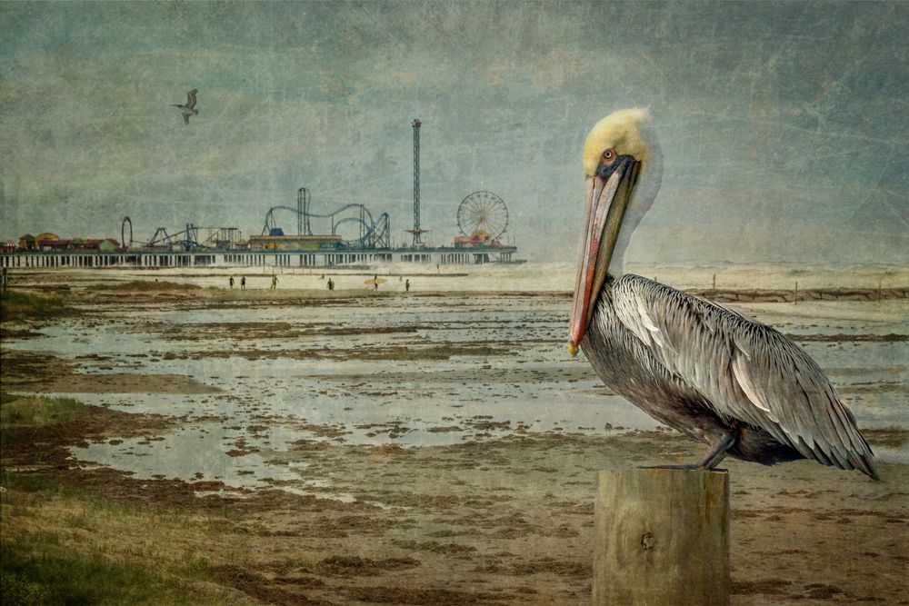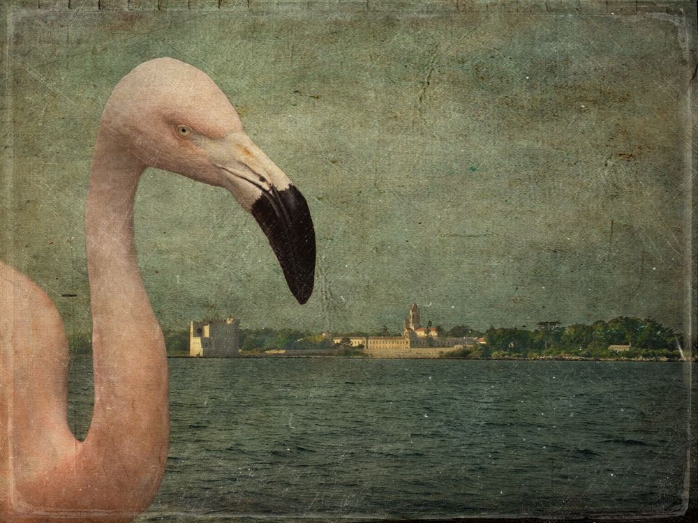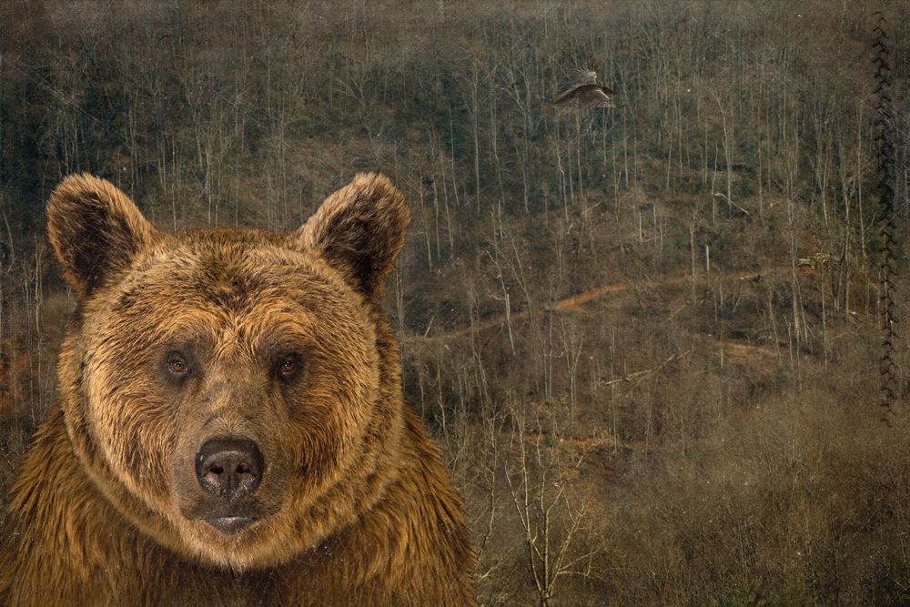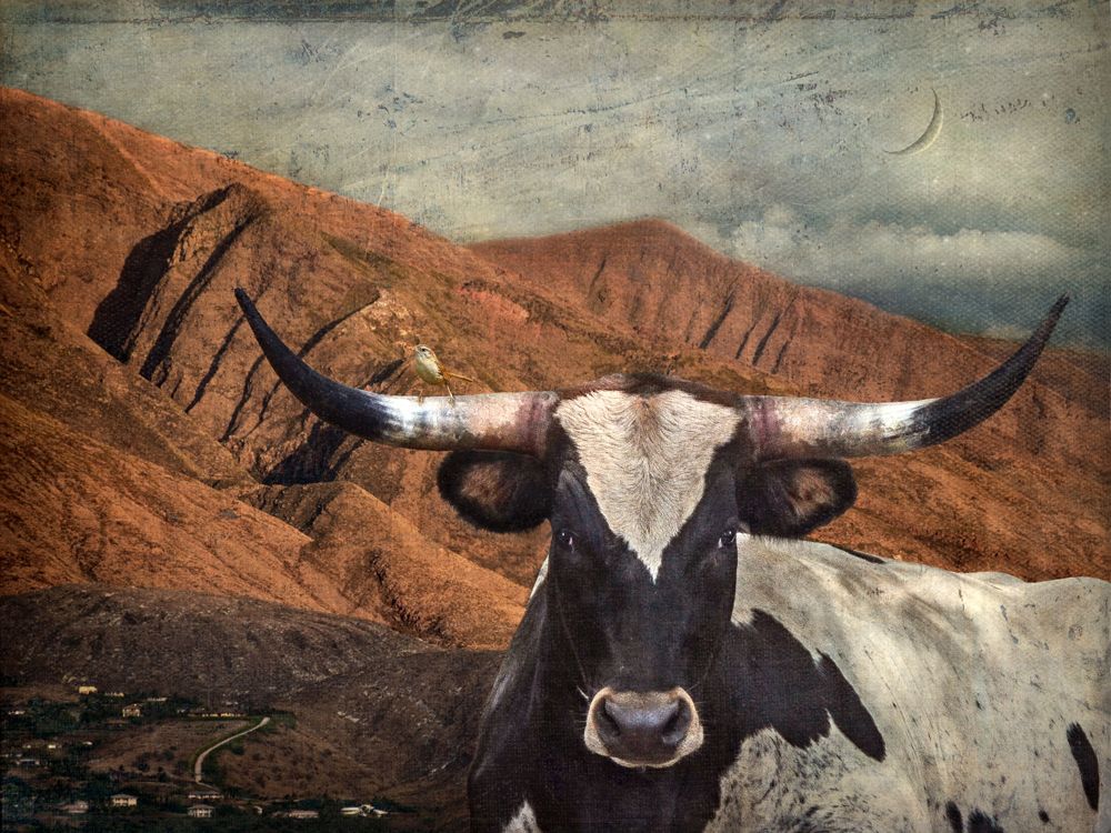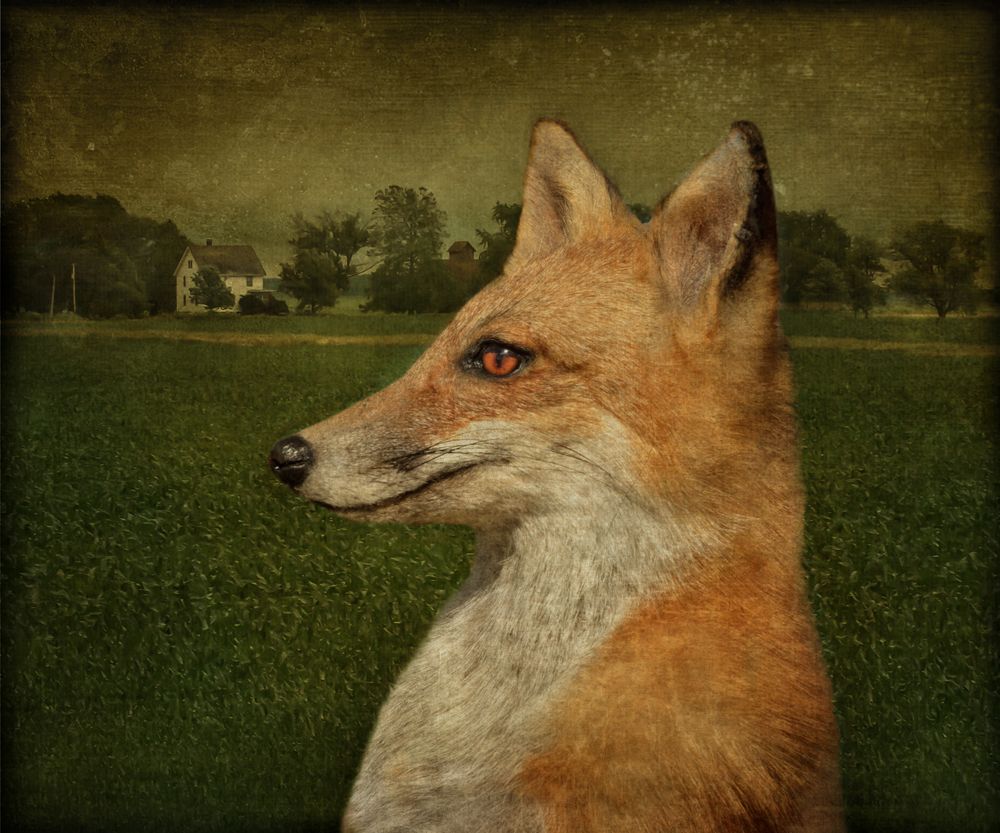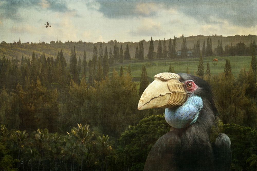 Curious about taxidermic animals and the reasons they are stuffed, mounted, and displayed as trophies and as natural history specimens, I began using photos of both preserved and living animals encountered on my travels, whether seen on a farm or in a museum, shop, or rescue environment. Combining these images with my landscape photographs in a montage process creates formal portraits similar to the style of portraiture championed in Renaissance painting.