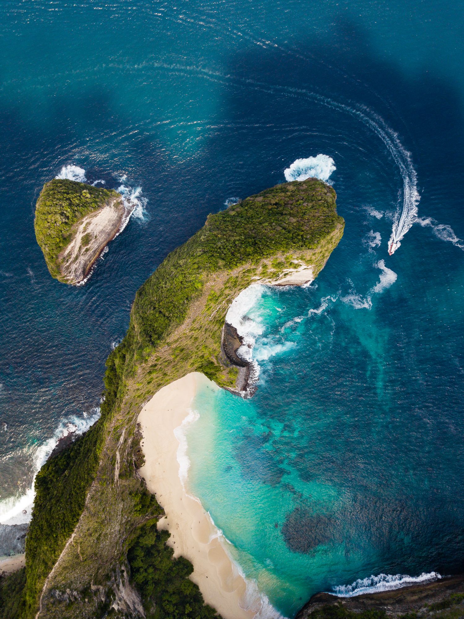 A top-down view of Kelingking beach in Nusa Penida, Bali - Indonesia, captured by a drone.