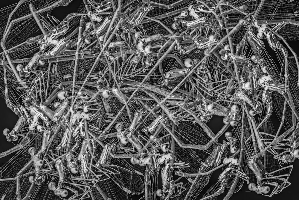 Multiple exposure image of dead damselflies. The image was converted to B&W and after that converted to negative. It is a protest against the excessive use of pesticides produced by multinationals as Bayer and Monsanto.