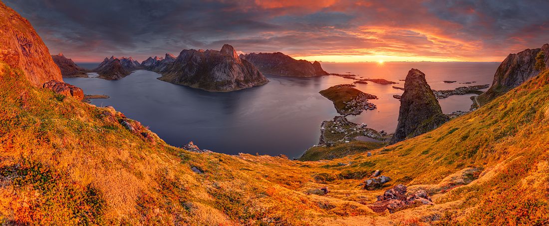 Here we go–another stunning panorama taken at the photo expedition to Norwegian Lofoten from last Autumn. Over hundred photos of various exposures, focusing planes and antireflection frames – it all showed from the very beginning that this one won’t be easy to process. It took me almost a year to dig in and hope it worths the effort. This photo is taken at my favorite spot discovered by myself. There is no official hiking trail and you have to climb some parts up. But at the end, it offers exceptional view with zero risk of photographer’s crowd that you are use to in tourists areas in Reine.