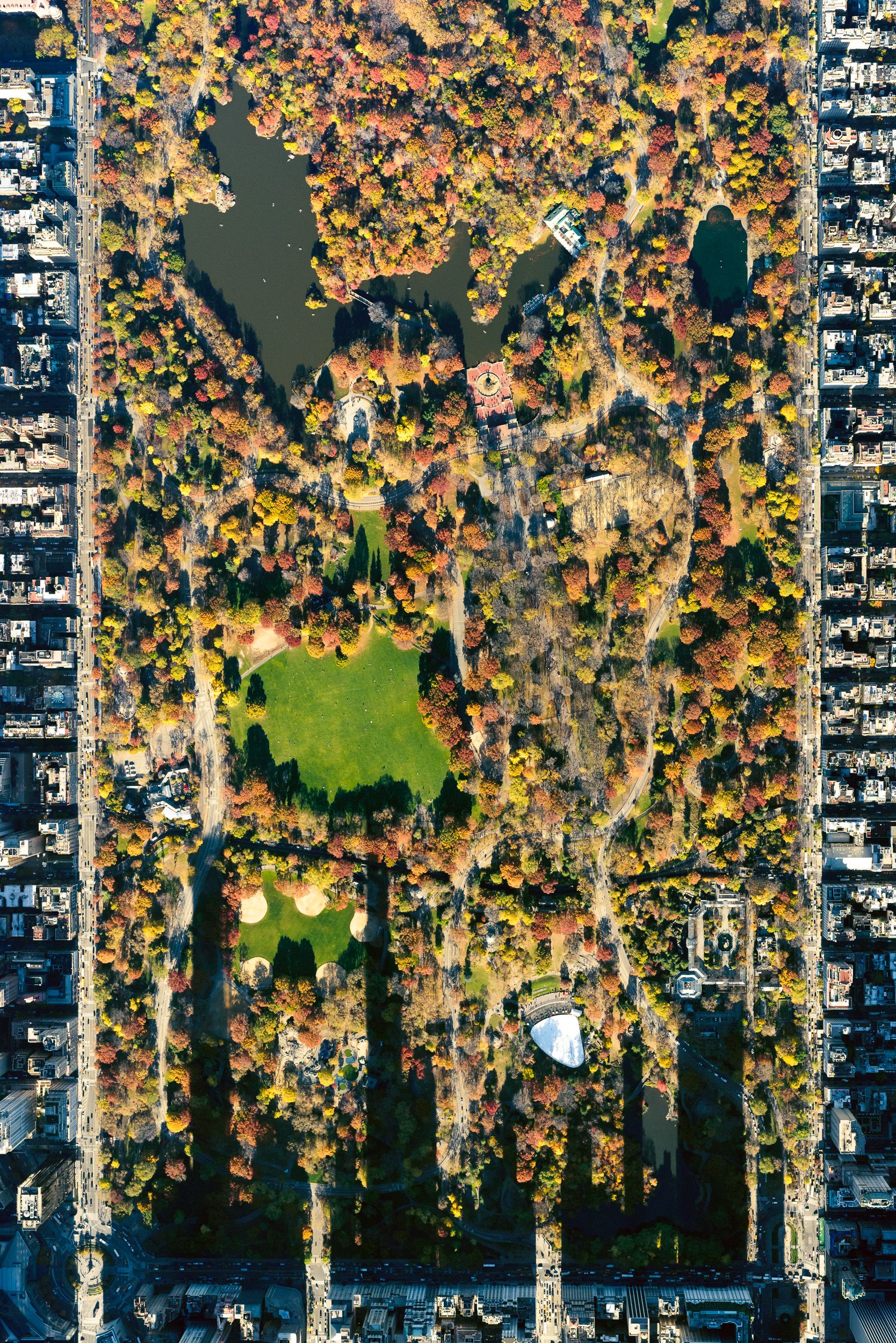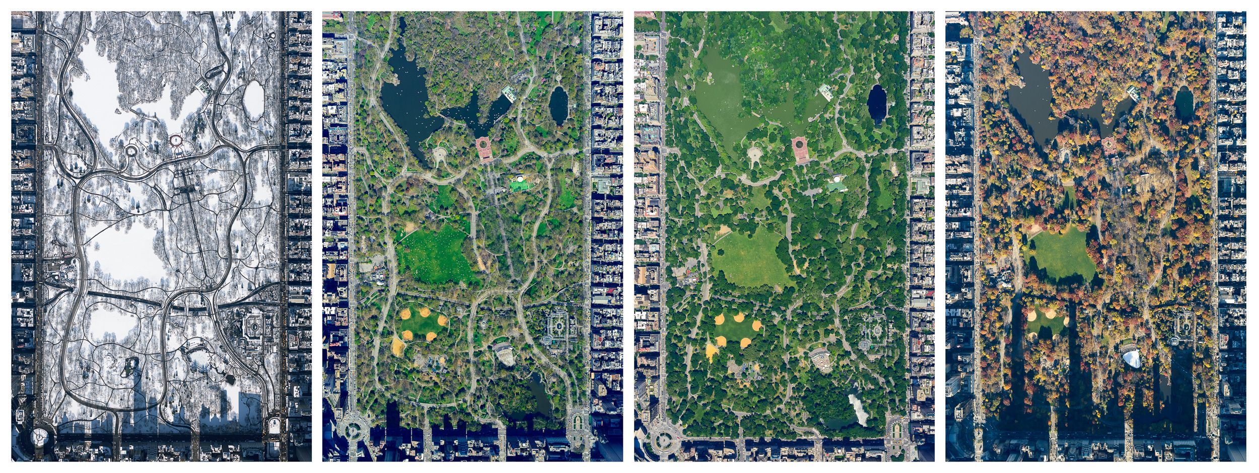 An iconic New York landmark photographed from the same overhead point at the peak of each season. Times and dates have been carefully selected for maximum effect; position of the sun, casting shadows over the course of the year is always perfectly aligned along the surrounding avenues. Photographer - who was also the pilot of the airplane - had only minutes to capture each moment. This series is meant to pay the homage to Park's unique architecture, and show respect to nature's work in the center of the Concrete Jungle. It's final presentation is a large format, extremely detailed quadriptych.