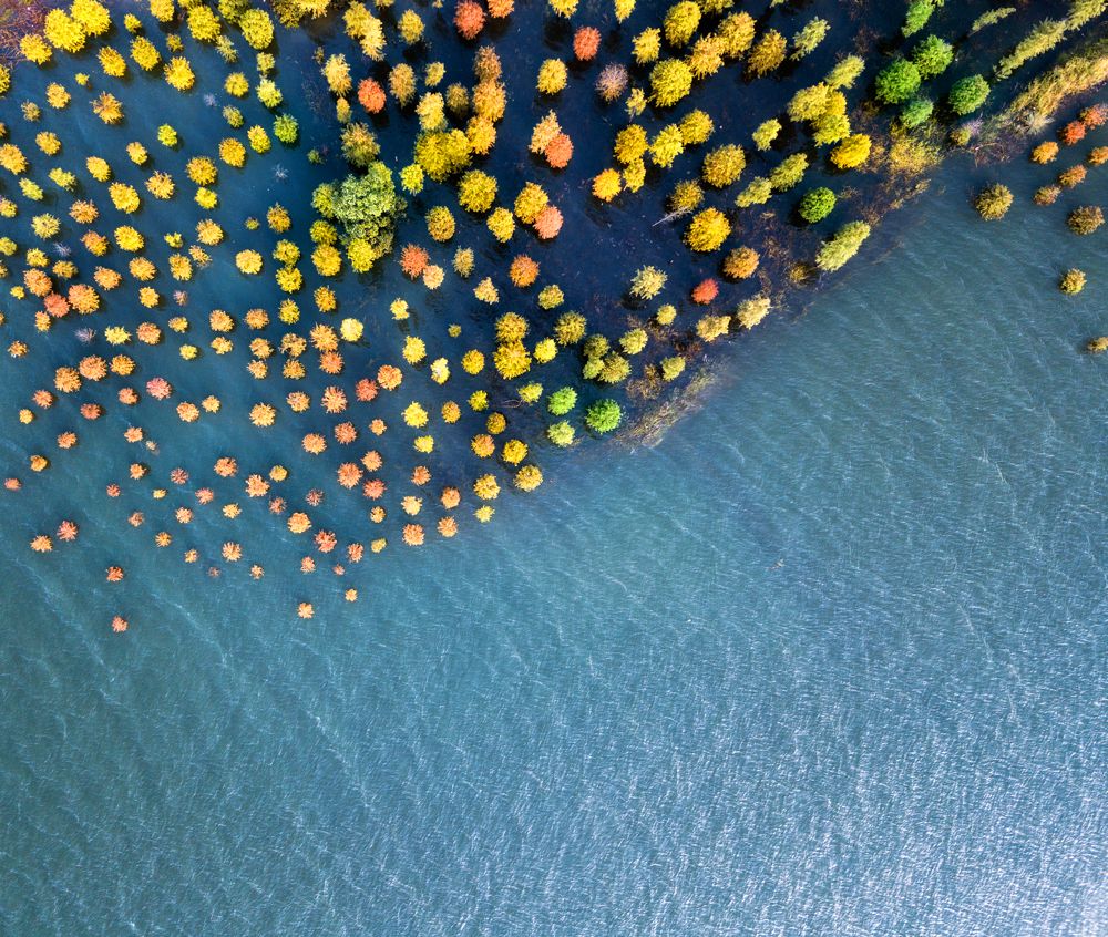 An aerial photo of some woods which grow in a water reservoir in Taizhou, China. As it was shot during the late autumn, all the leaves changed color and from the above angle, they look like tiny cookies.