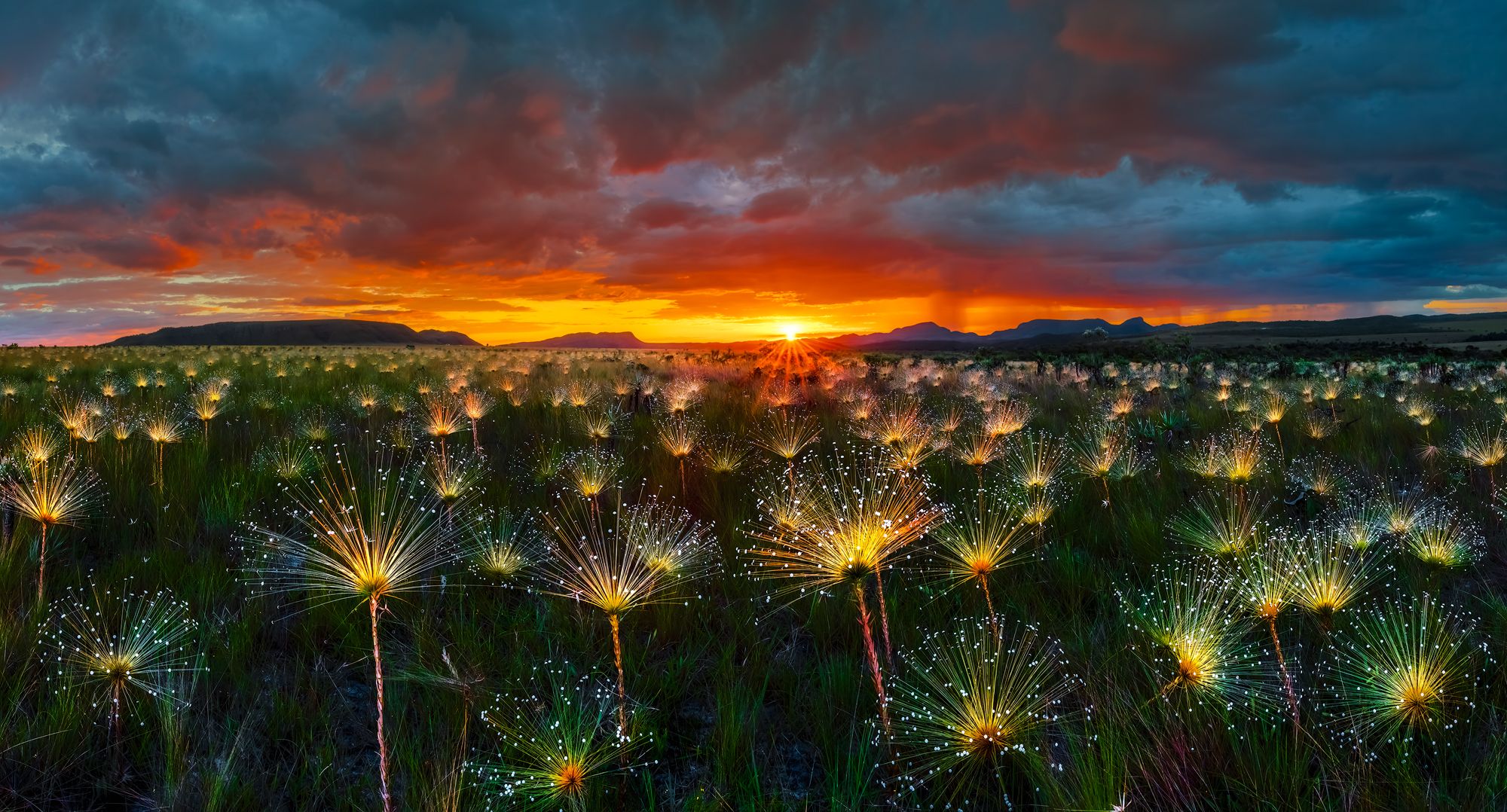 Panoramic of a field of wild flower Paepalanthus during sunset. This is a rare plant that is born in only a few places in the Cerrado, the Brazilian savannah. Chapada dos Veadeiros National Park Brazil