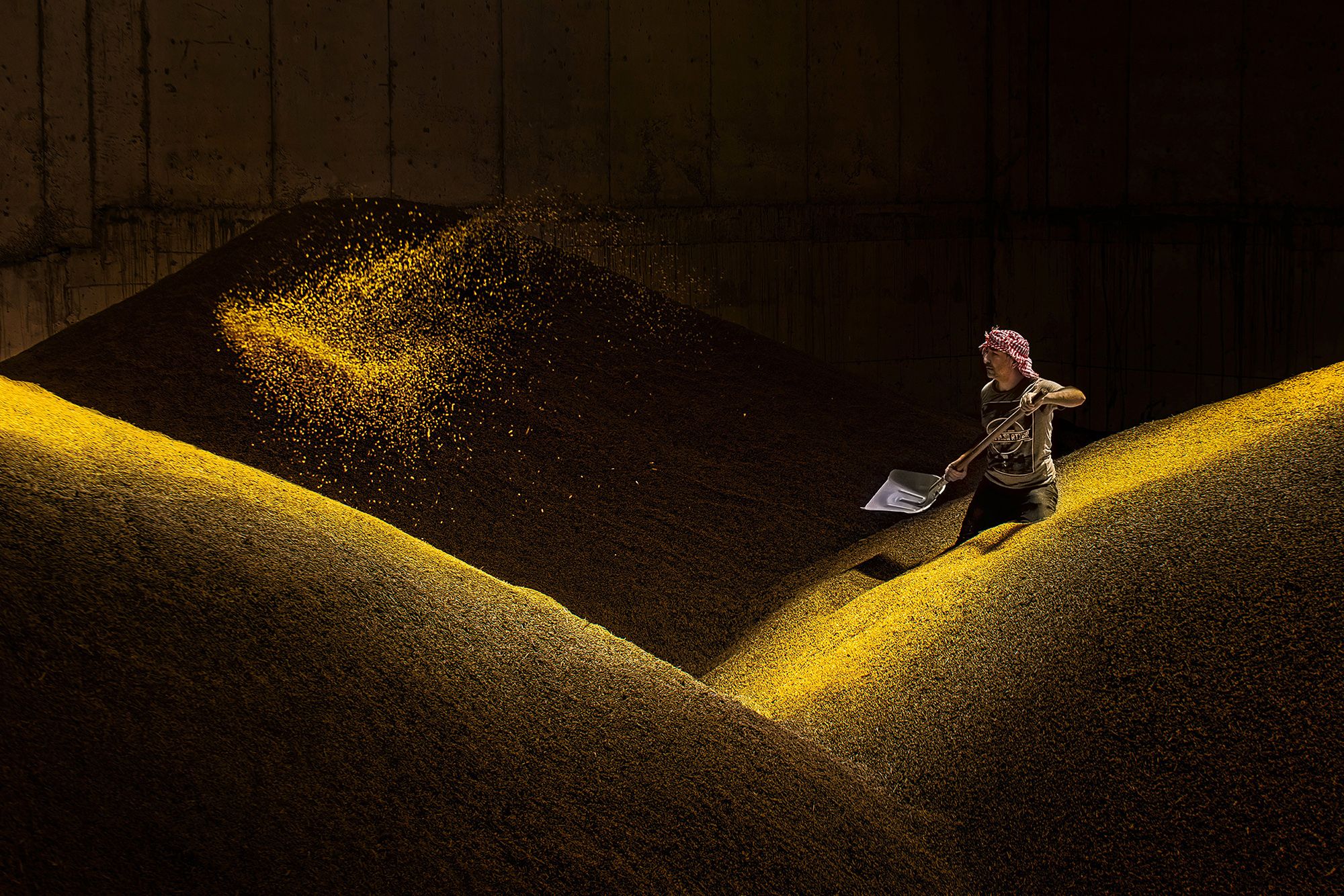 A farmer in a wheat warehouse... In the central Anatolia, the land of sun and history, the farmers call the wheat as "gold". It not only due to its color but also its worth is the same with gold for them. It reflects the lights of sun, the source of life, and gives lives to countless species. When I saw the light shining on the “gold”, I took this photo where the farmer was working on the hills made of grains. I believe this image presents all deep meanings, using the powerful combination of the motion and the photography.