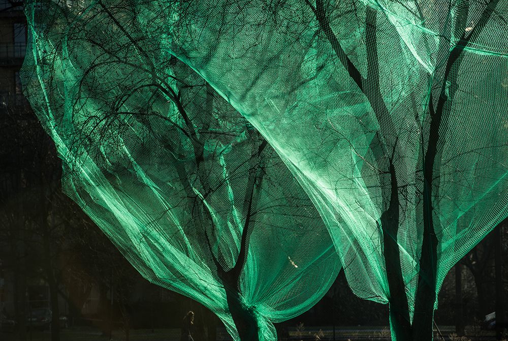 This strange installation looks like artificial foliage... The trees are wrapped in a net which is designed to protect them against salty air-aerosols during winter...