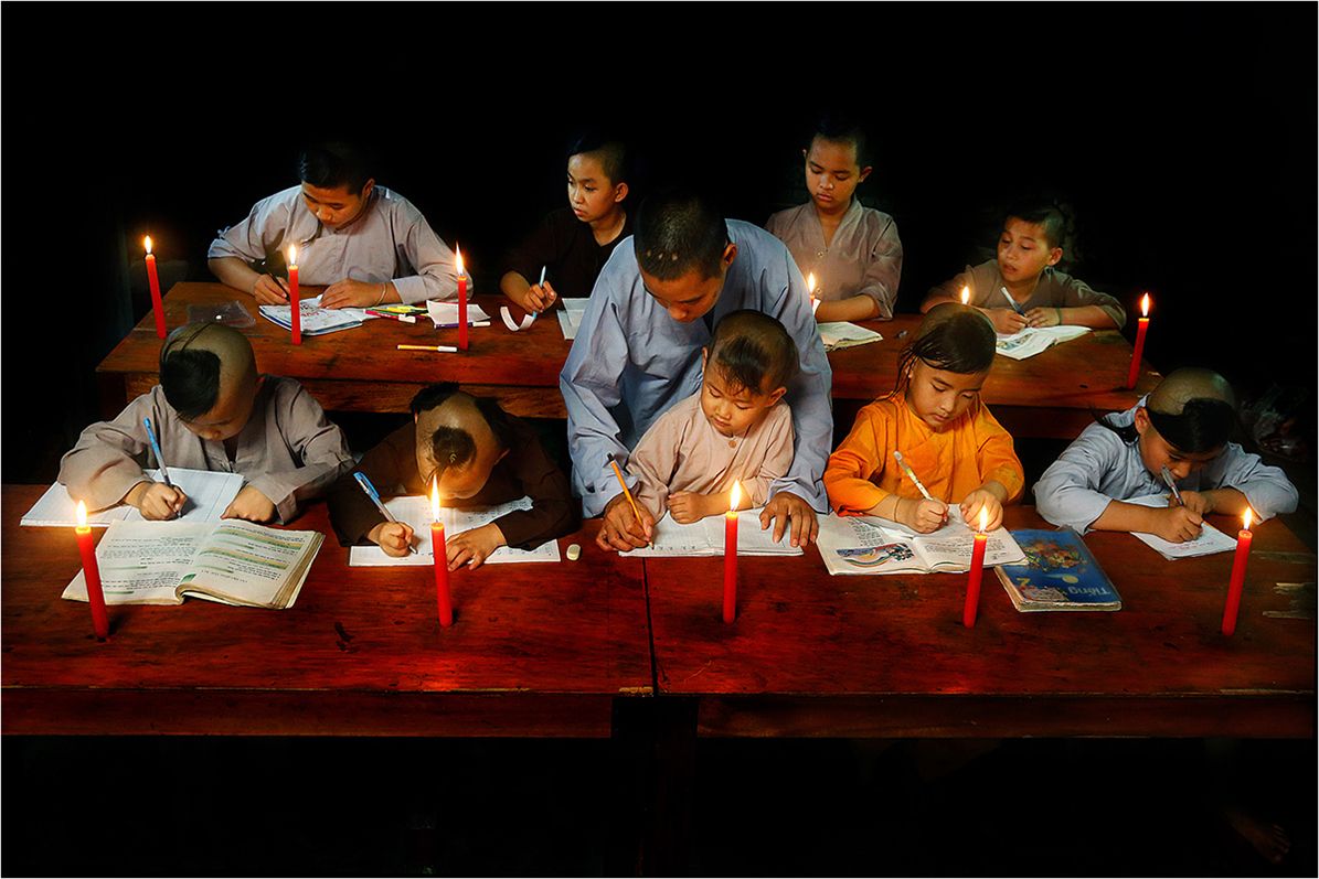 Young girl orphans are raised by nuns in a small temple of Central Vietnam and they are taught with Vietnamese language in the evening.