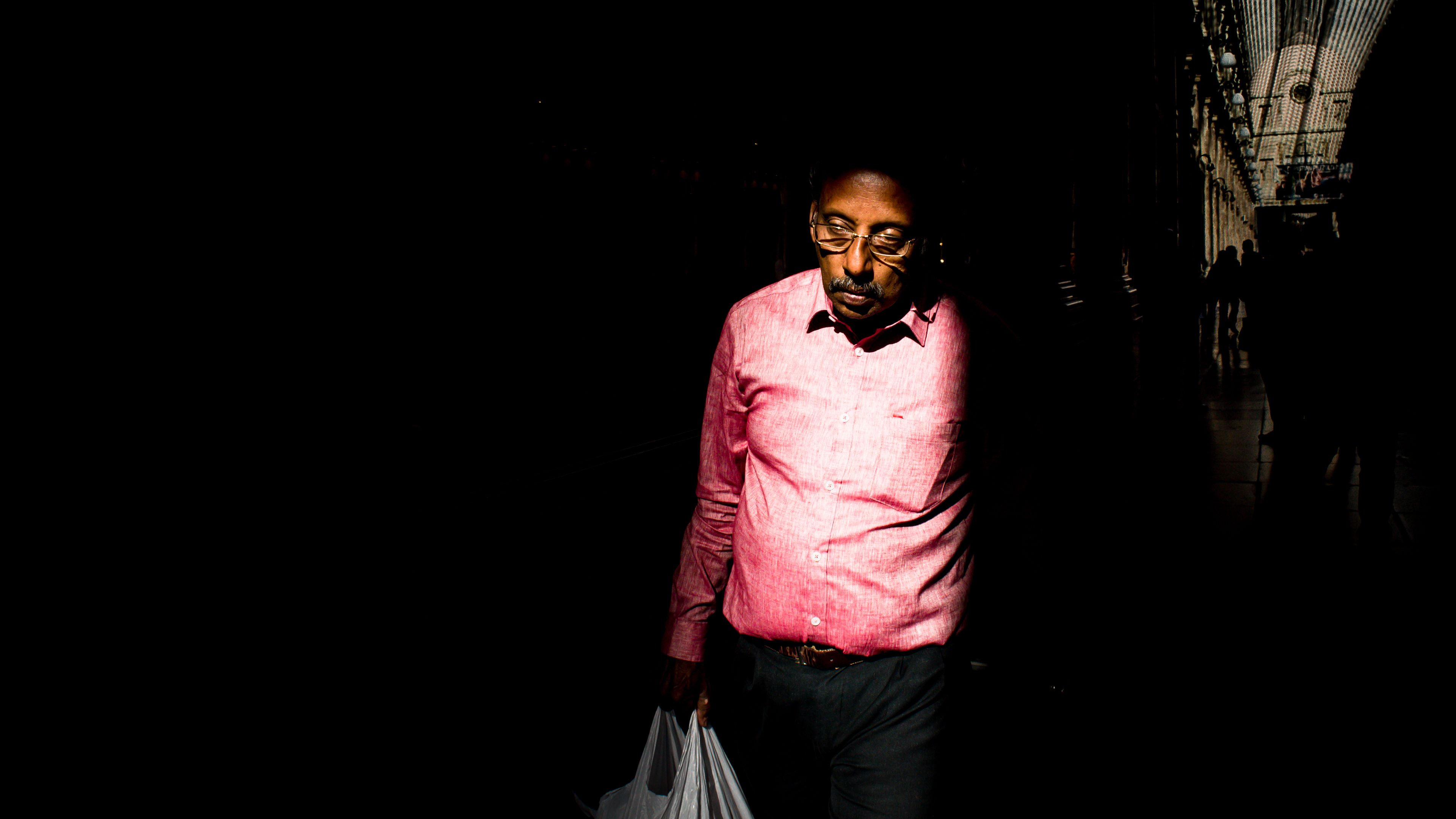 This series of photos came from a special place and time during a wandering in the streets of Brussels. In front of the entrance of the oldest galleria of Europe, during certain hours of the day, there is a ray of light that pierces the darkness and light up the people. I spent one week trying to get the best results to tell uniques stories about each person in this series.