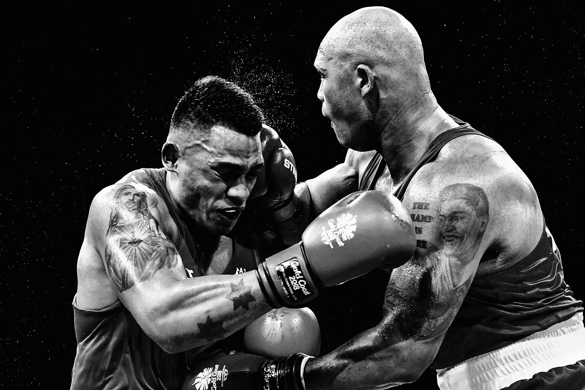 This image was taken at the 2018 XXI Commonwealth Games in Gold Coast, Australia of the bout between Clarke of the United Kingdom (right) against Australia's Vou Siutu (left). The quarter final heavyweight bout ended with Clarke victorious.