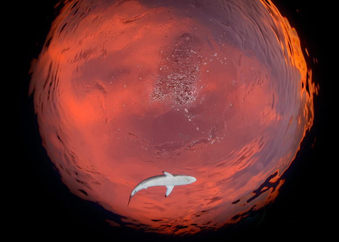 In 1492 A.D., the Spanish navigator Christopher Columbus was in his way to discover the New World, and when he passed the islands, he named them “Queen's Gardens”. Now, Queen's Gardens are under strict protection of Cuba government, it presents rich ecological diversity underwater. In accordance with the weather forecast, the weather of next day was not good. A nightfall, I shot this scene of evening glow underwater. Because I used the fisheye lens, also due to the shooting angle, this photo was shot in this way.