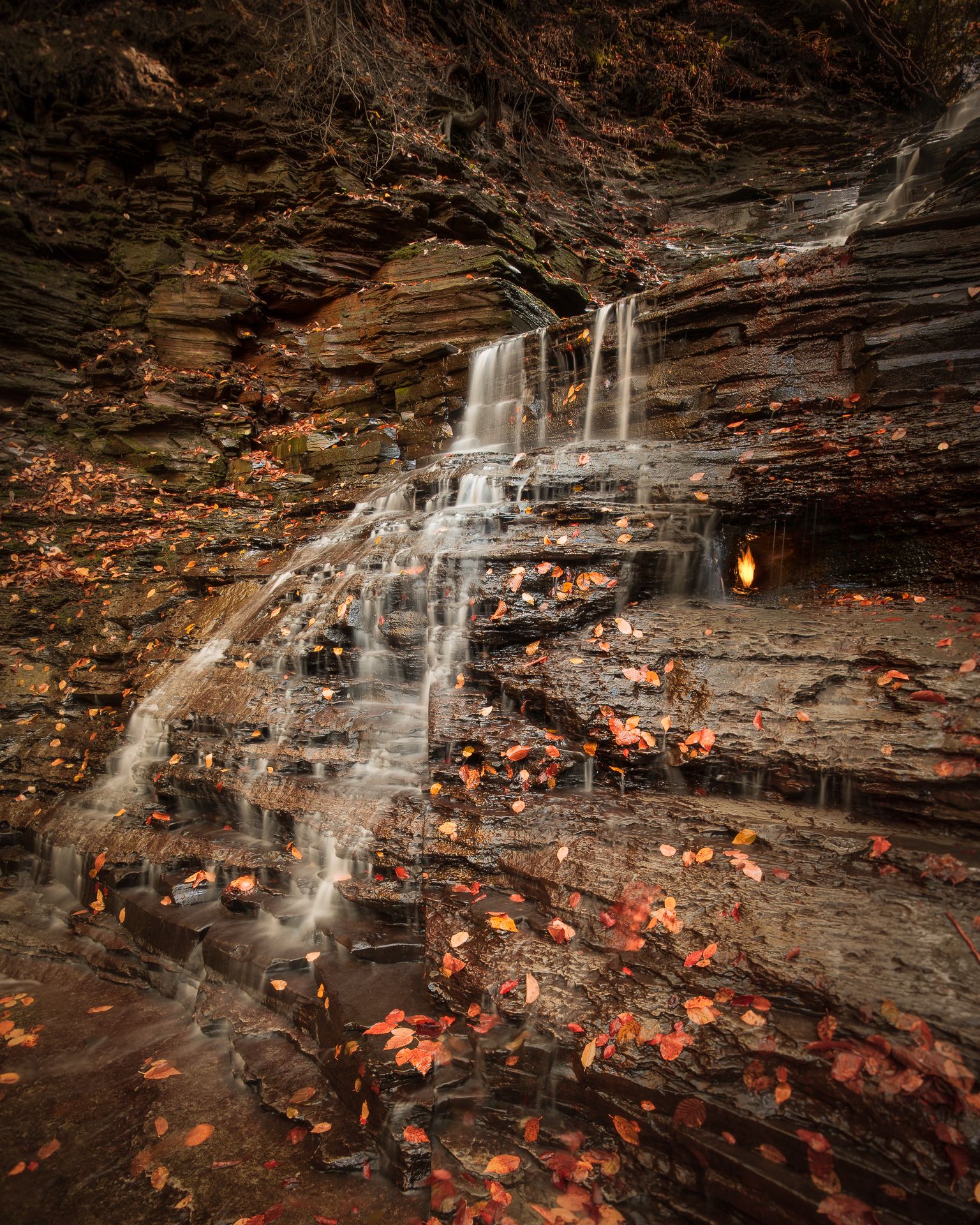 Seemingly an image of a mere waterfall in autumn, a closer examination reveals a flame hidden behind the water. This is the paradox of New York’s Eternal Flame Falls. The waterfall hides within it a natural fissure releasing a steady stream of methane nurturing the flame.