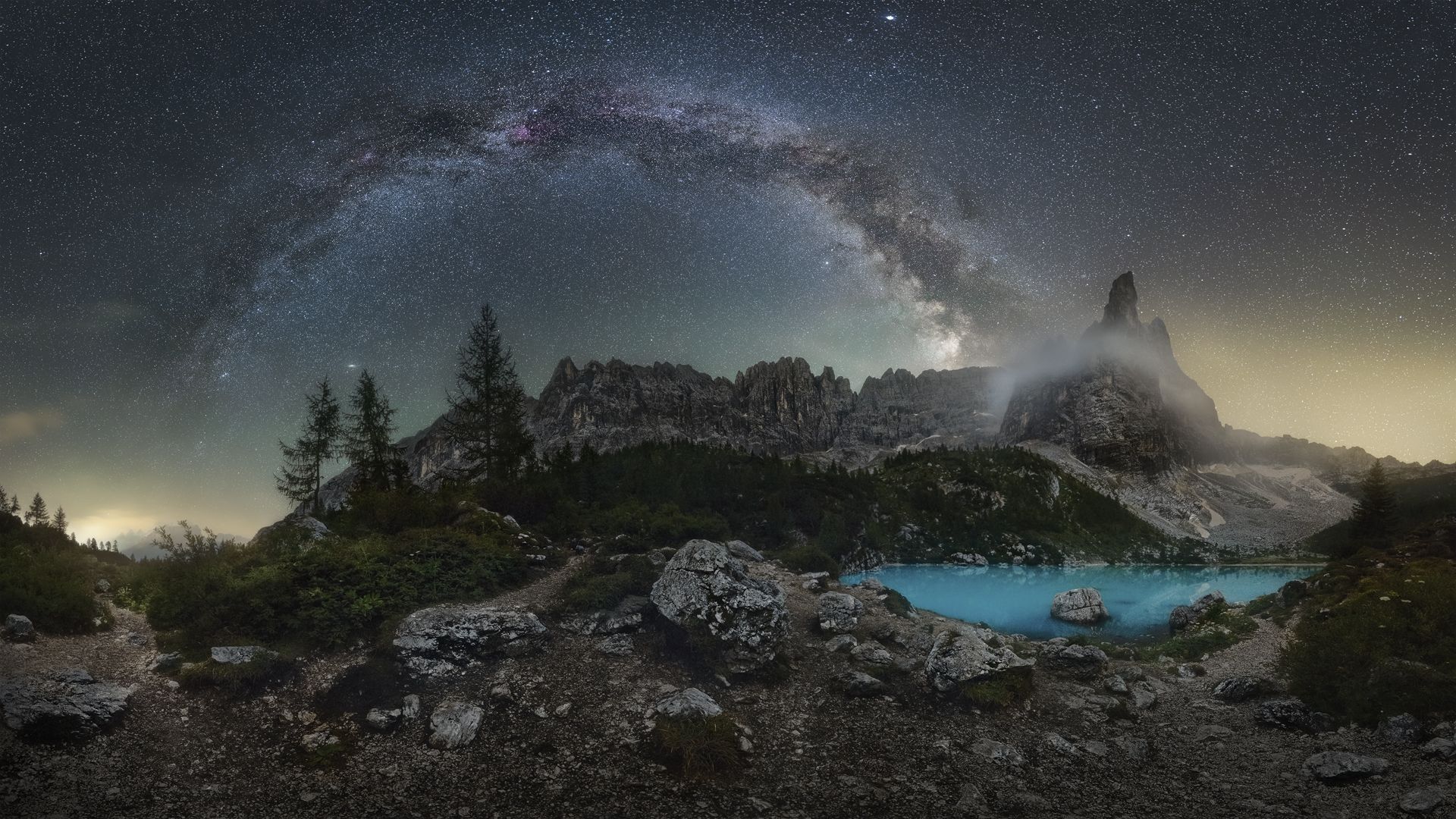 Lake of Sorapiss, the magic lake. In my opinion, the most magical place in the Dolomites! Hidden at almost 2000 meters and surrounded by large mountains, it can only be reached through a long hike lasting about 2 hours. It was very difficult to reach him with a heavy backpack over 20 kg but the result made me very happy! I made a 180-degree panoramic photo to capture this paradise while the Milky Way framed the sky.