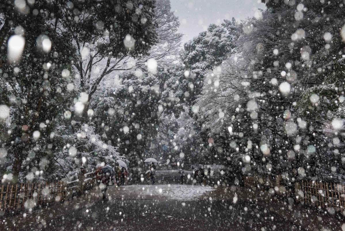 Tokyo, Meiji Jingu Shrine's outer gardens on a heavy snow day. A breeze caused the accumulated snow to fall out of the trees.