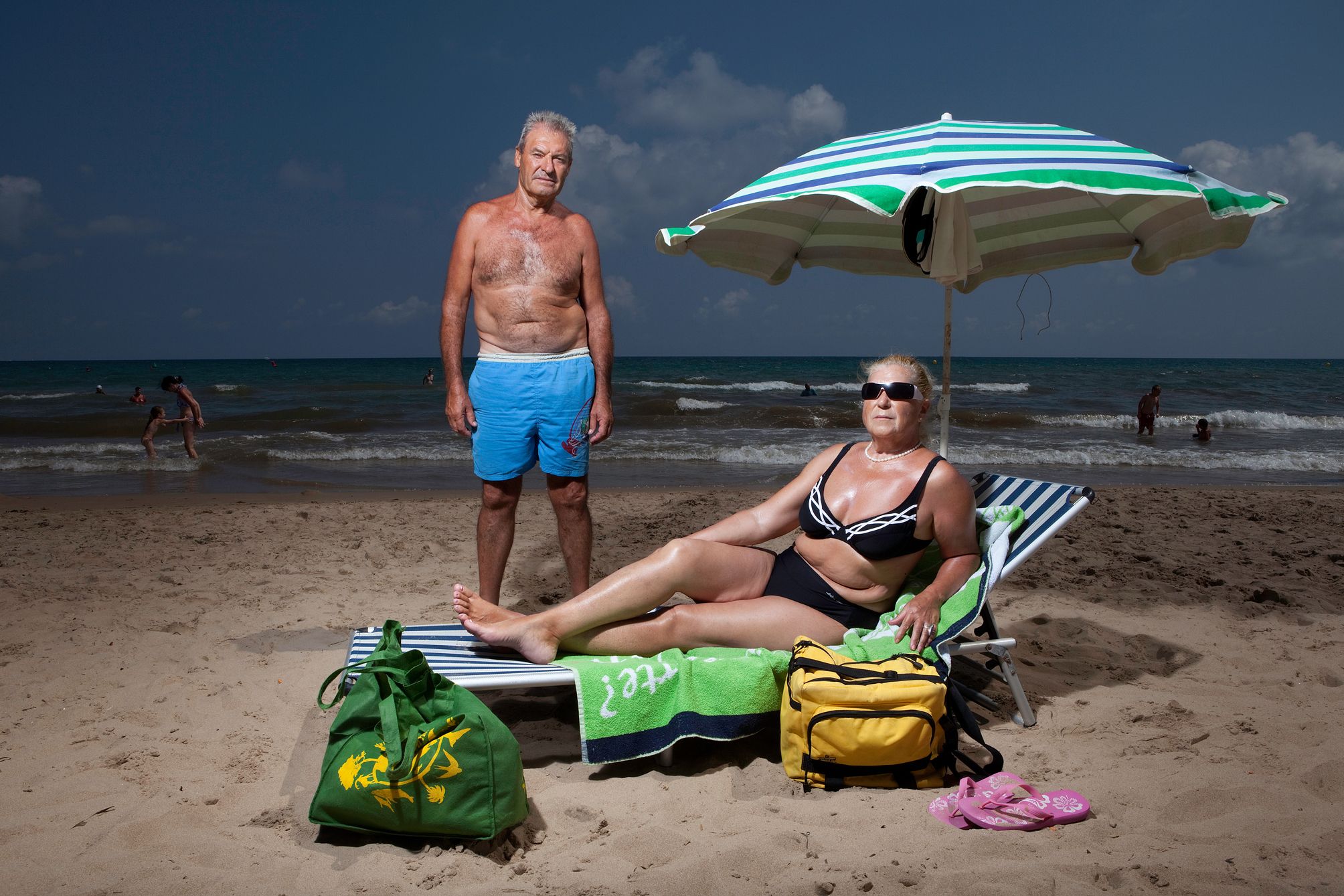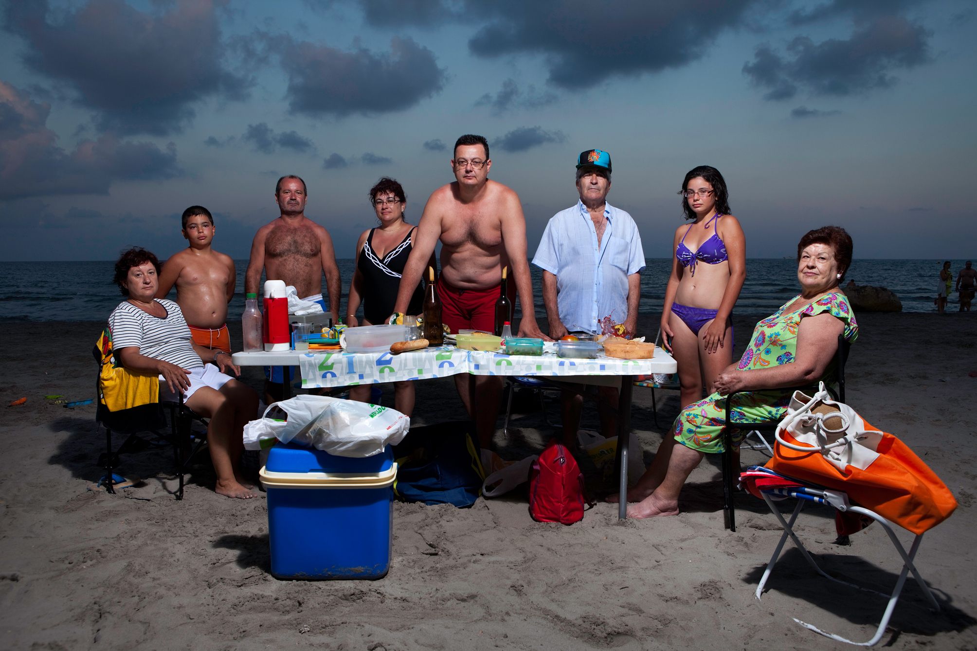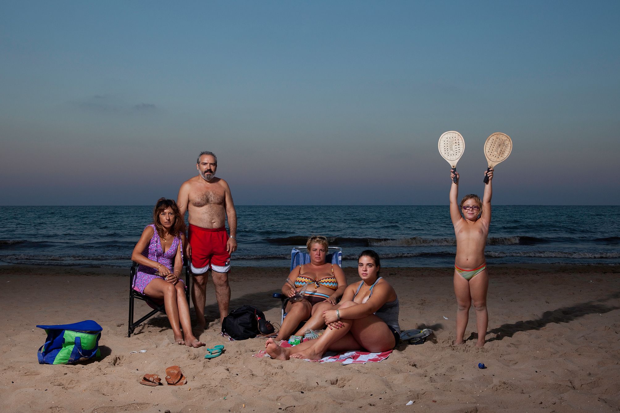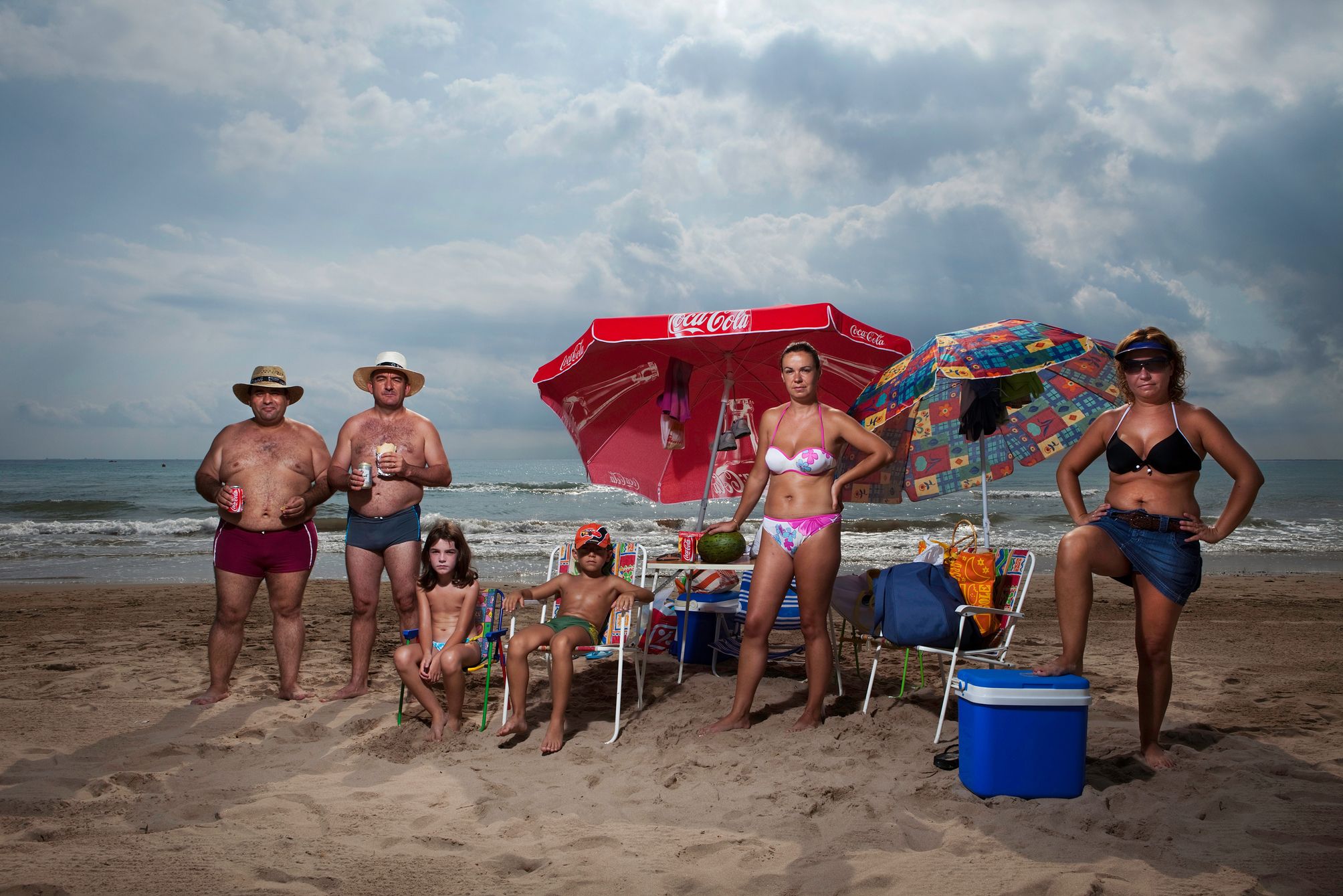 TRIBES is a social analysis, a raw portrait of occidental society. Groups of families and friends set themselves up by the sea equipped to spend a day in the sun. All this, harmoniously juxtaposed, seems like a poem of customs that reveal through humour, colour and tenderness, the profundity of a whole society. These photos of modern-day beach groups are inspired by the studio portraits of ancient tribes who proudly posed in traditional costumes next to their prized possessions.The sky and the sea become the painted backdrop of the studio and the sand seems as if sprinkled on the floor