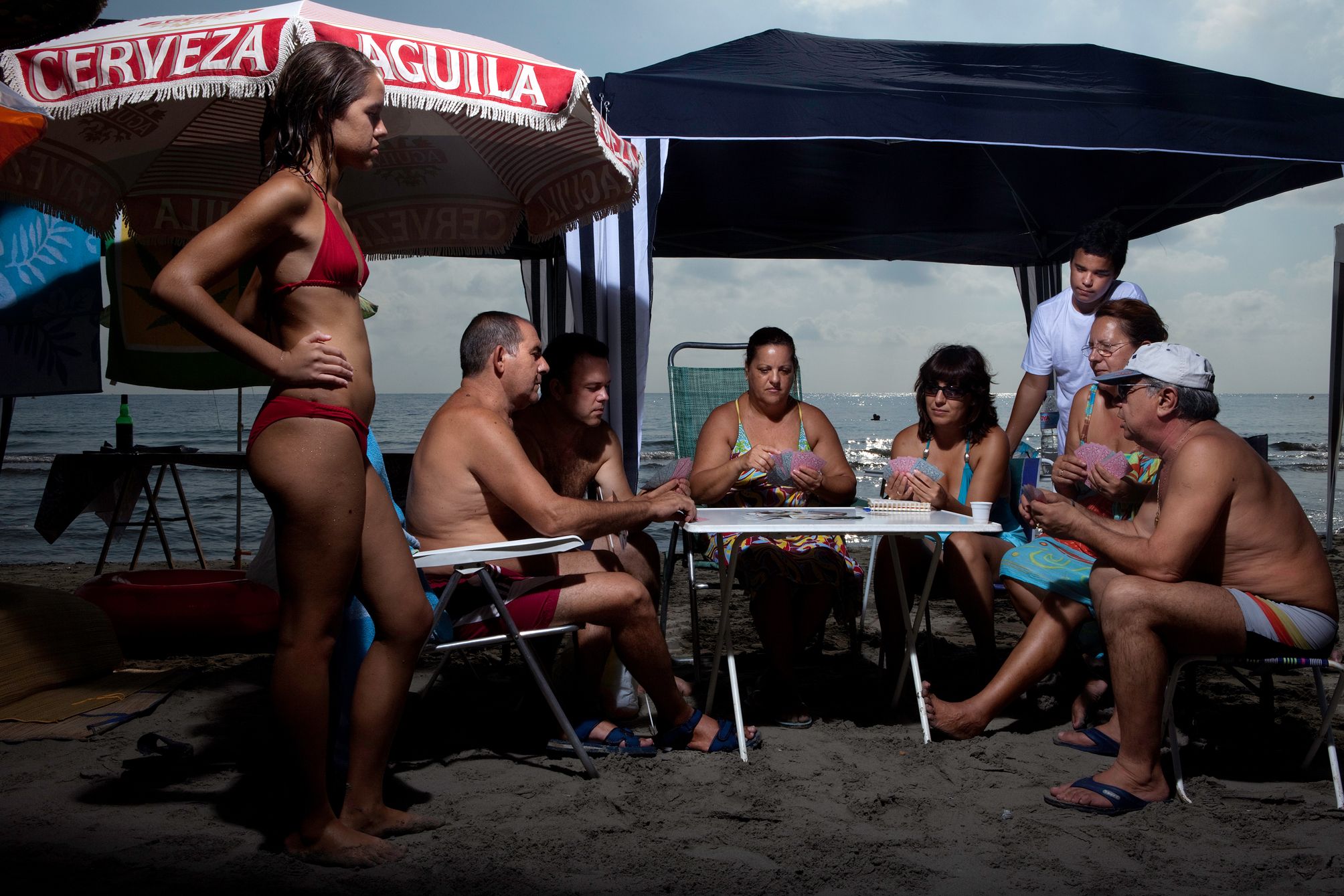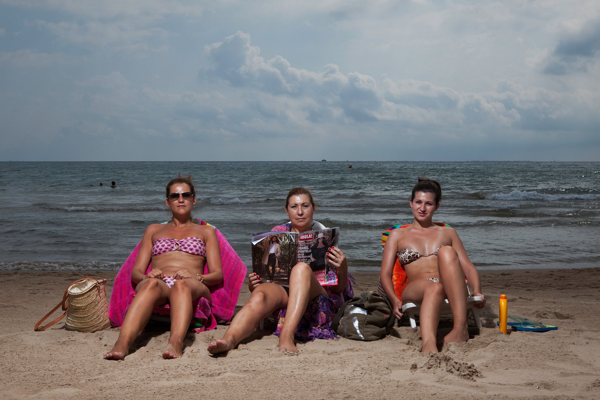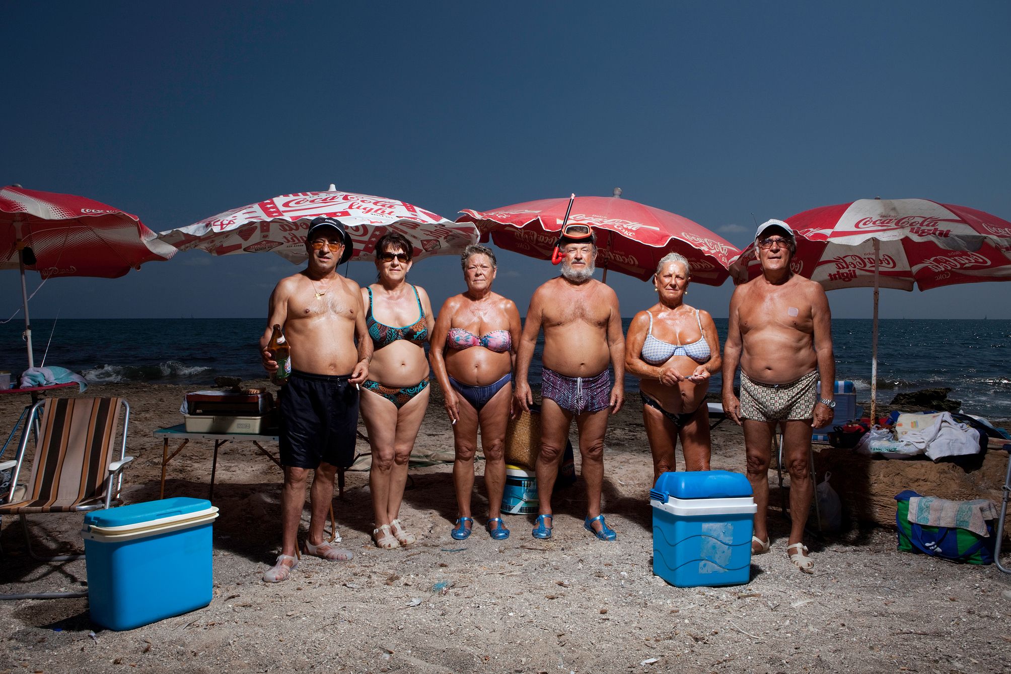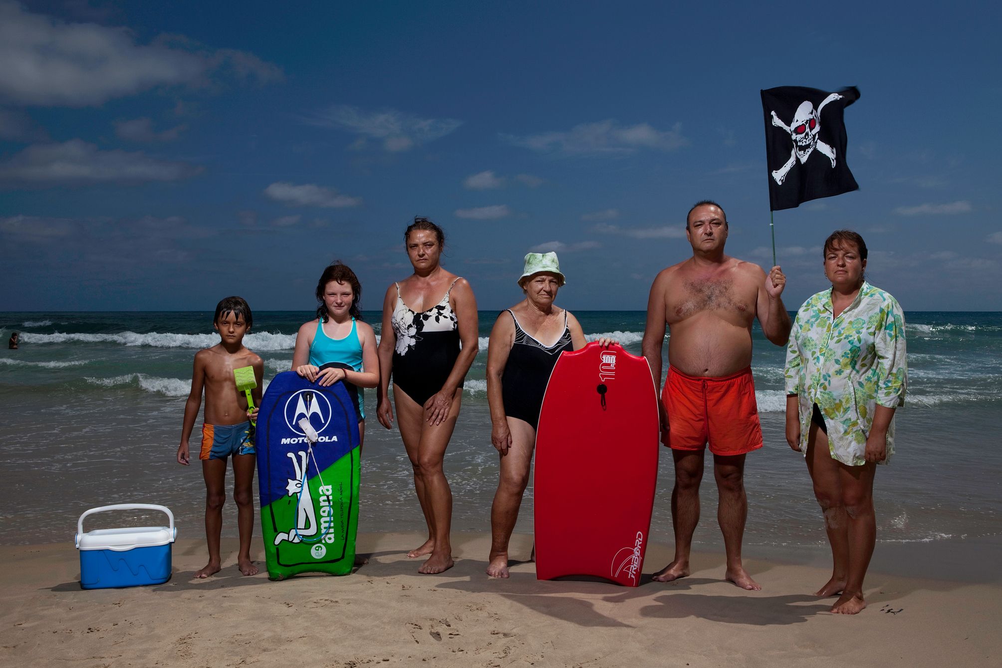 TRIBES is a social analysis, a raw portrait of occidental society. Groups of families and friends set themselves up by the sea equipped to spend a day in the sun. All this, harmoniously juxtaposed, seems like a poem of customs that reveal through humour, colour and tenderness, the profundity of a whole society. These photos of modern-day beach groups are inspired by the studio portraits of ancient tribes who proudly posed in traditional costumes next to their prized possessions.The sky and the sea become the painted backdrop of the studio and the sand seems as if sprinkled on the floor