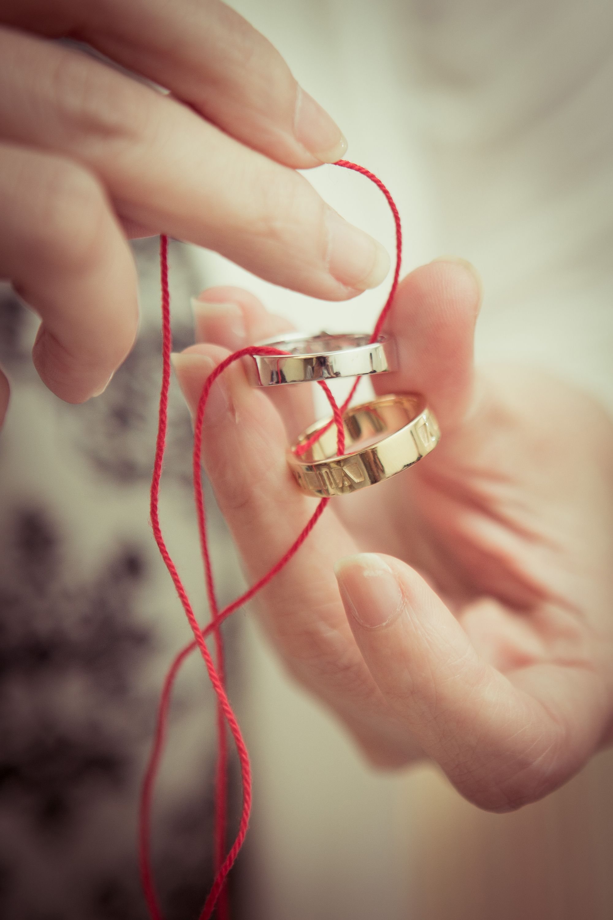 A wedding custom in Taiwan. Tie a gold ring and a bronze ring together. It symbolizes that the newlywed couple will have a blessed and happy life together.