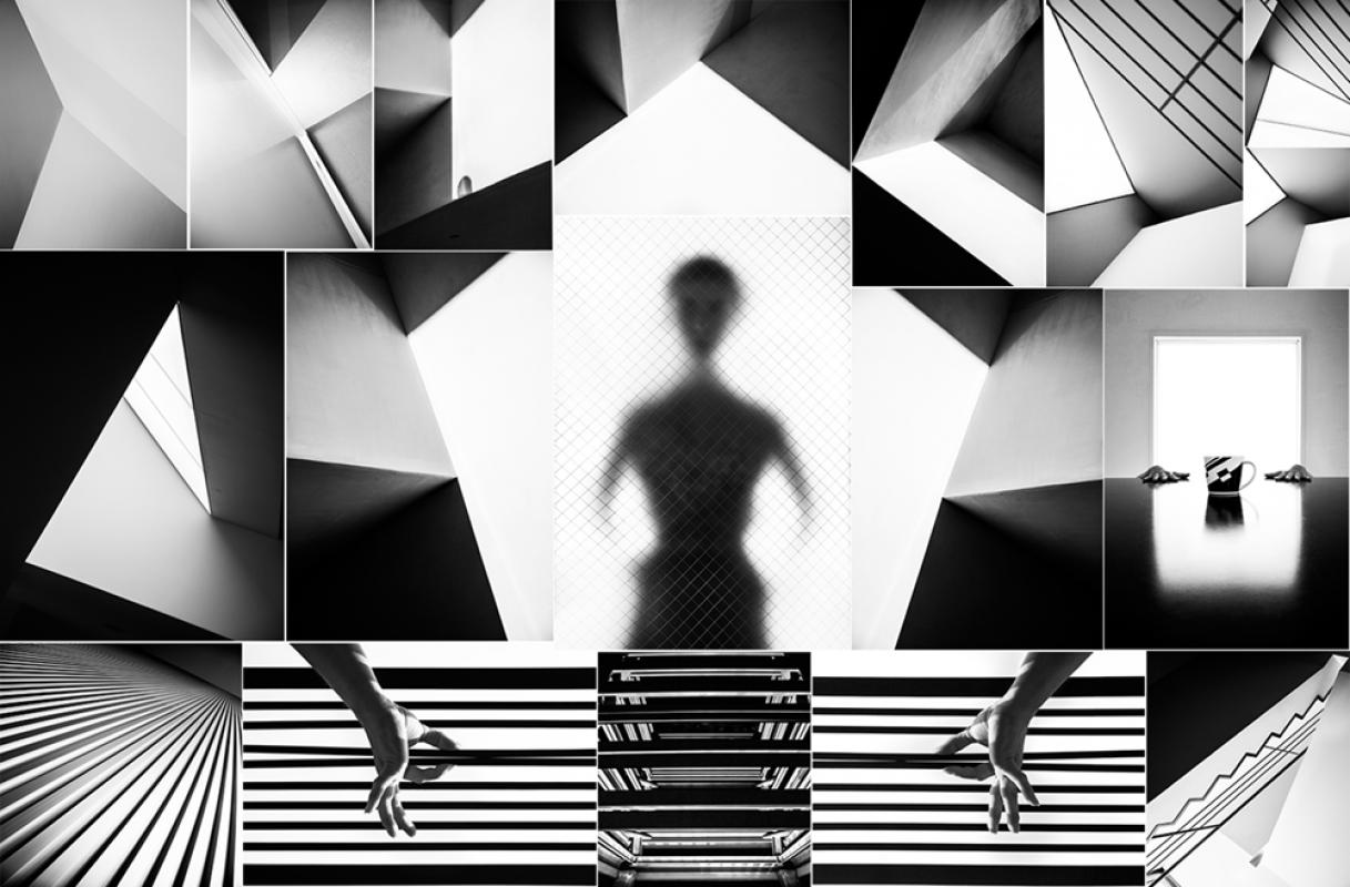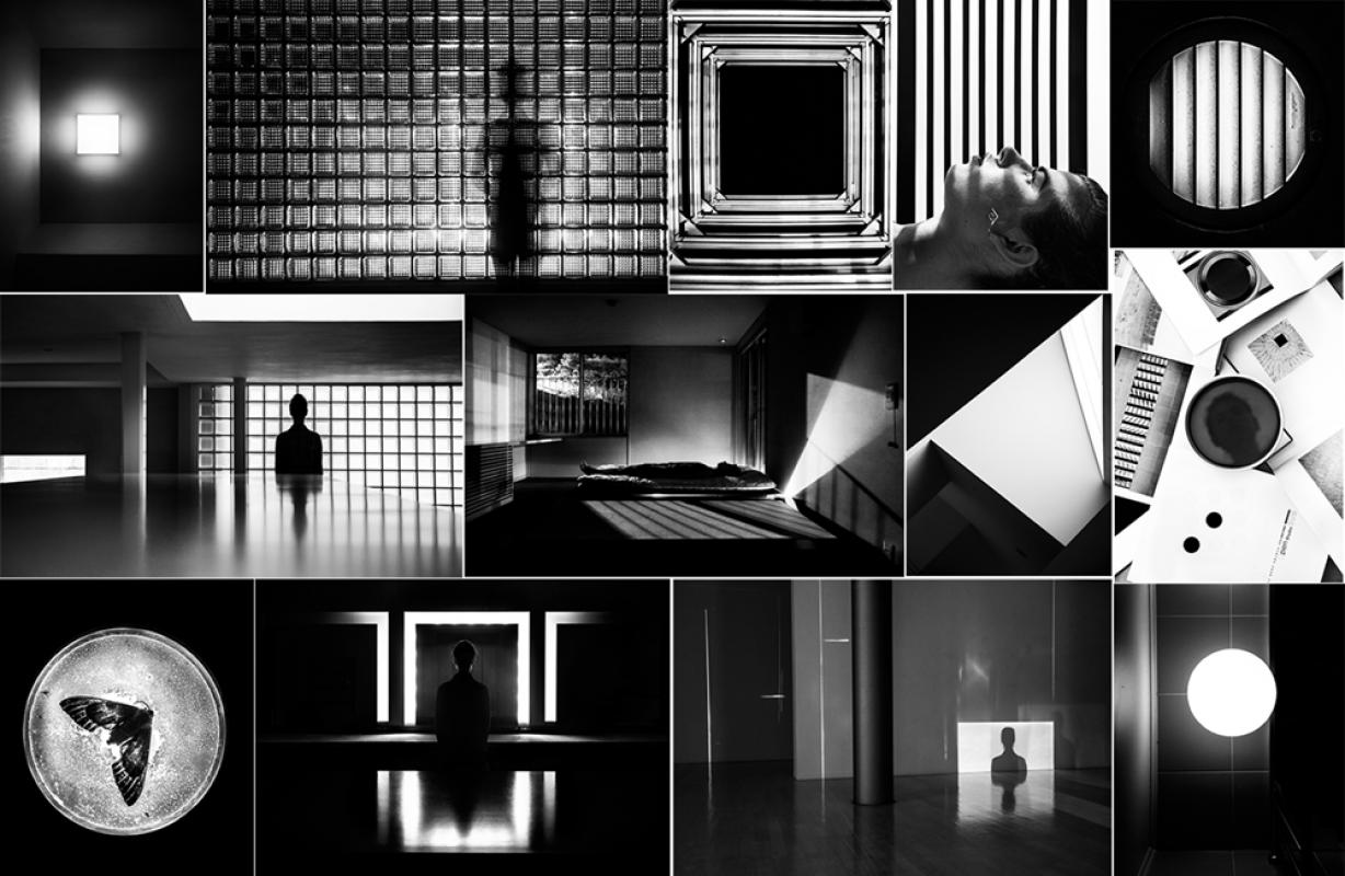 Yume - Yamaguchi, Japan While living in Japan, I stayed at the Akiyoshidai International Art Village. Inspired by the architectural designs of Arata Isozaki I witnessed my surroundings become a precise calculation, and began to see shapes created from the geometric structure I lived in. I had never seen the world as an optical illusion before–Light and shadow painted triangles, lines, and squares on every corner and edge of each room, reminding me that my environment, reality, our world is altogether greater than the sum of its parts. I discovered a true essence of synergy in Japan. Finding myself interlaced in a landscape of graphic shapes and abstract textures my reality soon became, Yume, meaning dream in Japanese. The series is presented with multiple images printed and mounted separately. Together creating a large scale photographic mosaic mural.